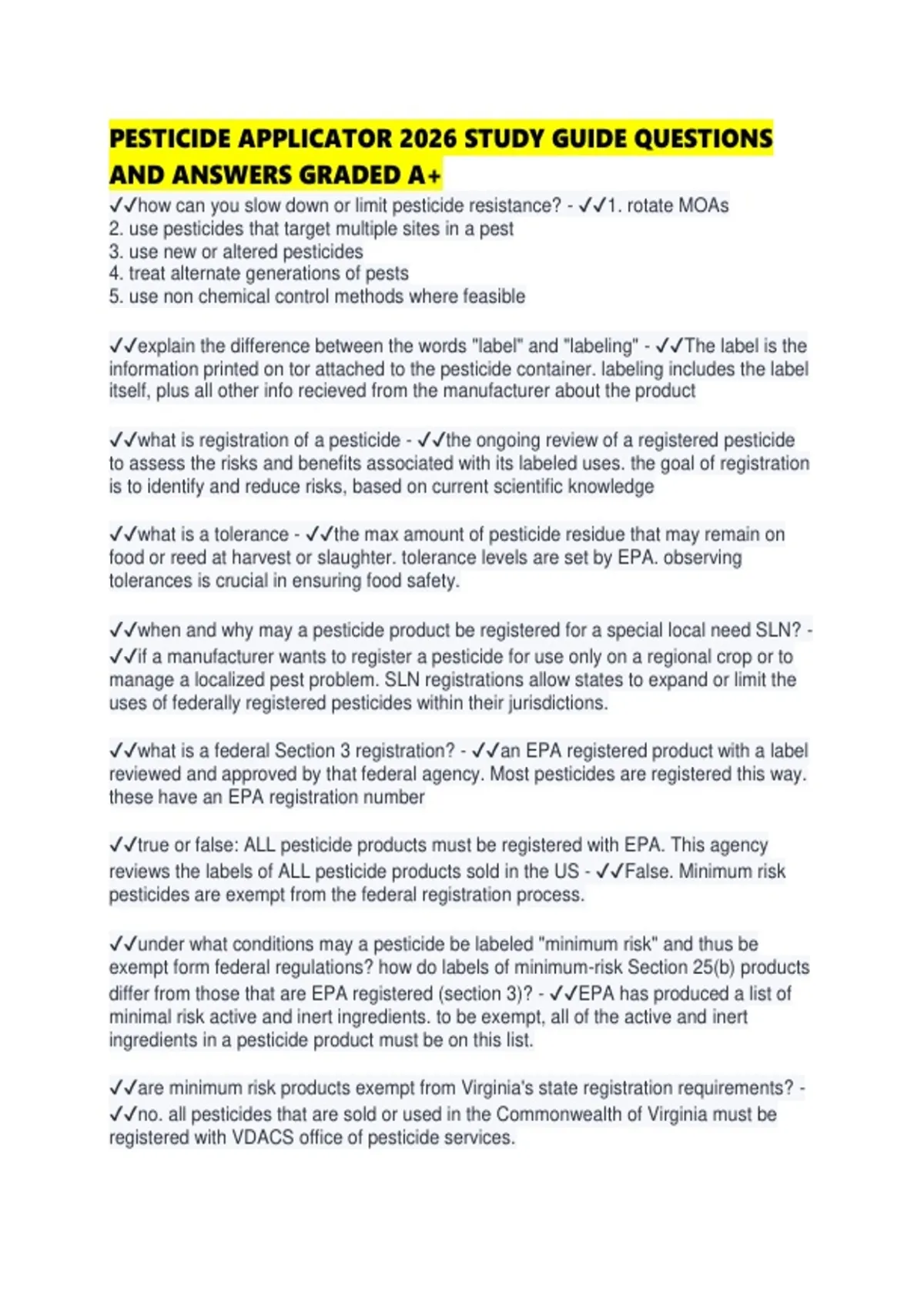 PESTICIDE APPLICATOR 2026 STUDY GUIDE QUESTIONS AND ANSWERS GRADED A+