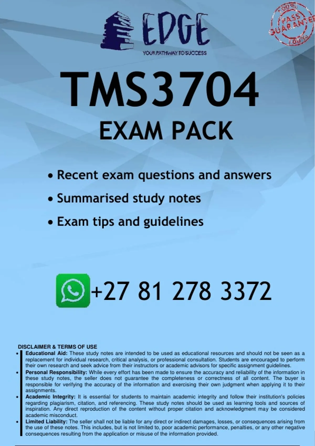 Well-structured TMS3704 EXAM PREPARATION PACK - DISTINCTION GUARANTEED. Contains recent exam questions and answers, and Summarised study notes. All you need to pass the 2026 EXAMS