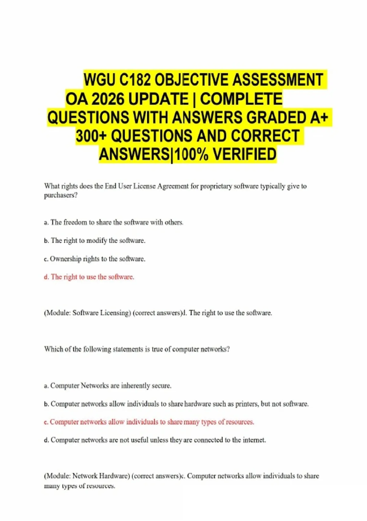 Accelerate your path to graduation with the ultimate study resource for WGU C182 Introduction to IT. This comprehensive document is fully updated for the 2026 Objective Assessment (OA), featuring over 300 verified questions and correct answers graded A+. Designed specifically for WGU students, this guide cuts through the noise to focus on the exact competencies needed to pass the high-stakes final exam. This guide covers the entire spectrum of IT foundations, including Hardware and Software (Proprietary vs. Open Source), Network Hardware (LANs, Topologies, and Shared Resources), and the intricacies of Database Management Systems (DBMS). Master difficult concepts like the Strategic Risk Analysis process, the history of computing generations, and the role of the CPU and RAM in system performance. The document also provides deep dives into IT Ethics and Professional Standards, exploring the legalities of EULAs, the Digital Millennium Copyright Act, and the importance of ethical benchmarks in a corporate environment. Whether you are learning about the structure of a URL, the difference between local and remote computing, or the stages of the Software Development Life Cycle (SDLC), this verified Q&A ensures you are studying the most relevant material.