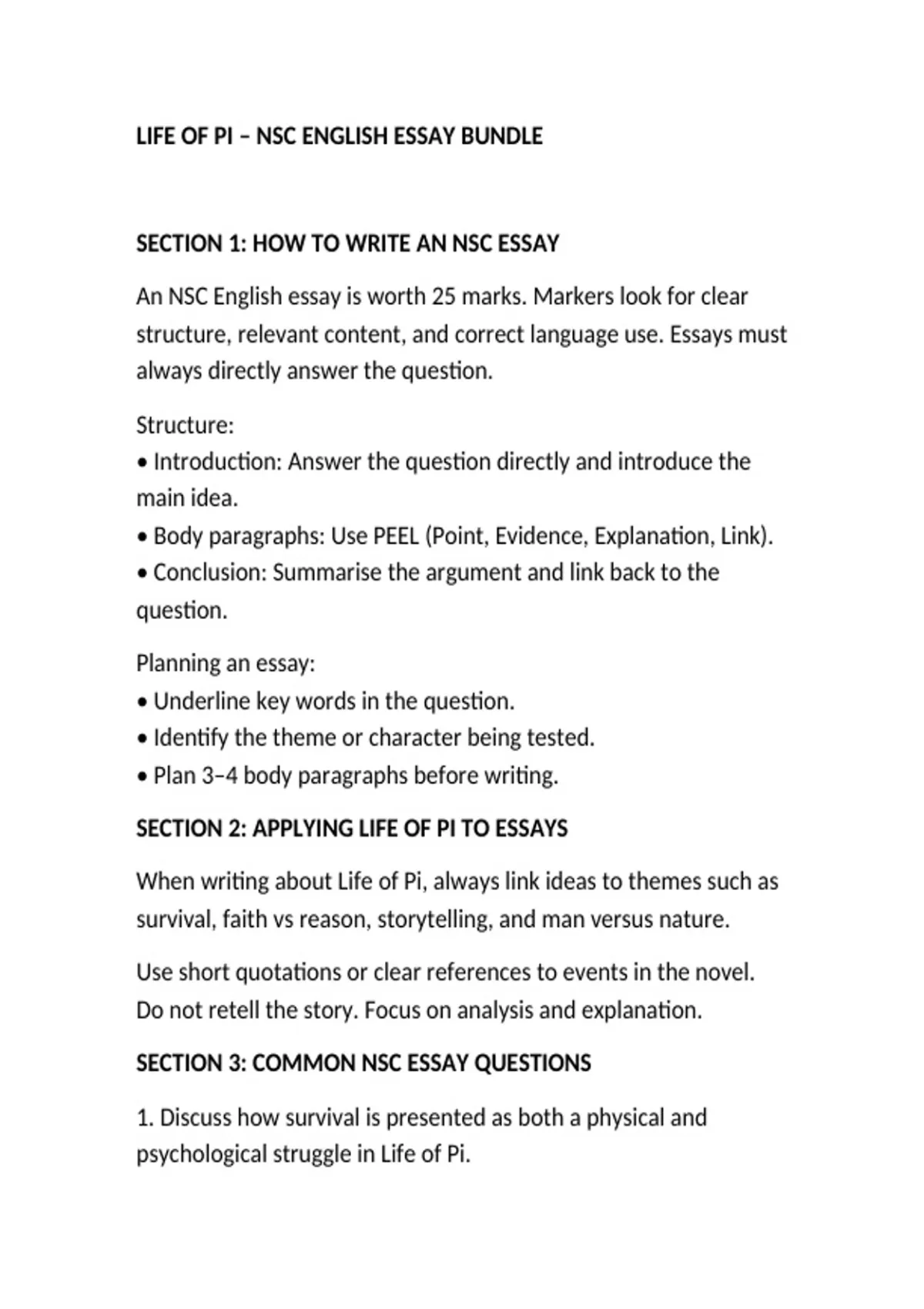 LIFE OF PI – NSC ENGLISH ESSAY BUNDLE