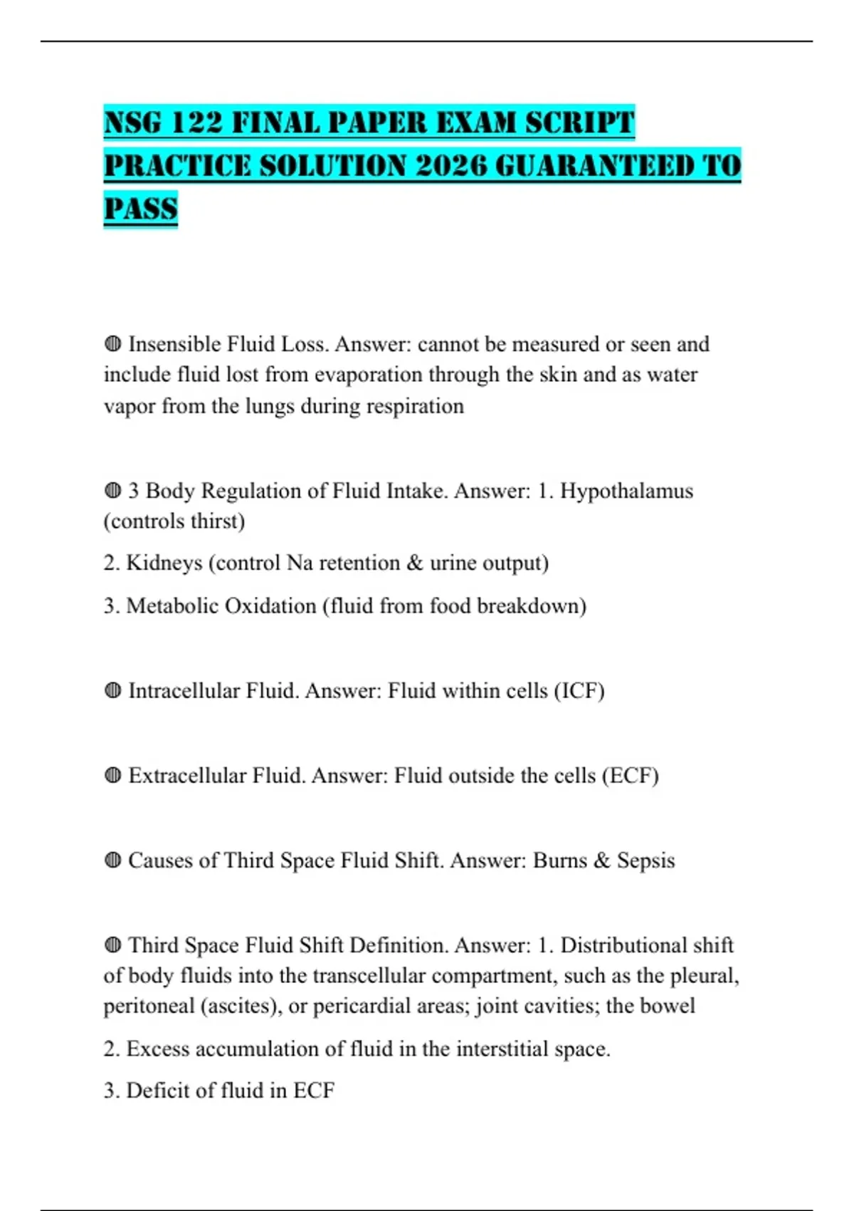 NSG 122 FINAL PAPER EXAM SCRIPT PRACTICE SOLUTION 2026 GUARANTEED TO PASS