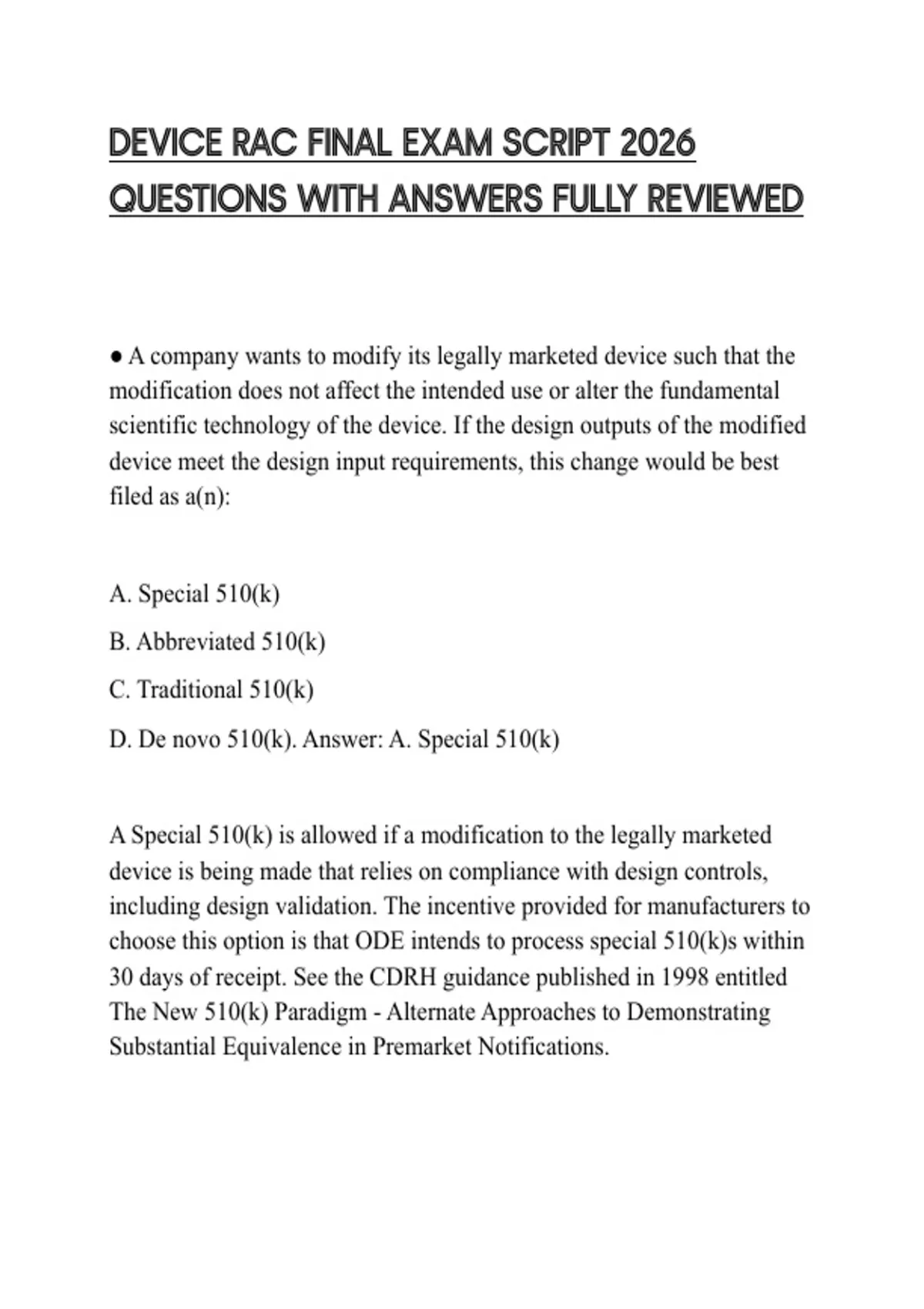 D. De novo 510(k). Answer: A. Special 510(k)