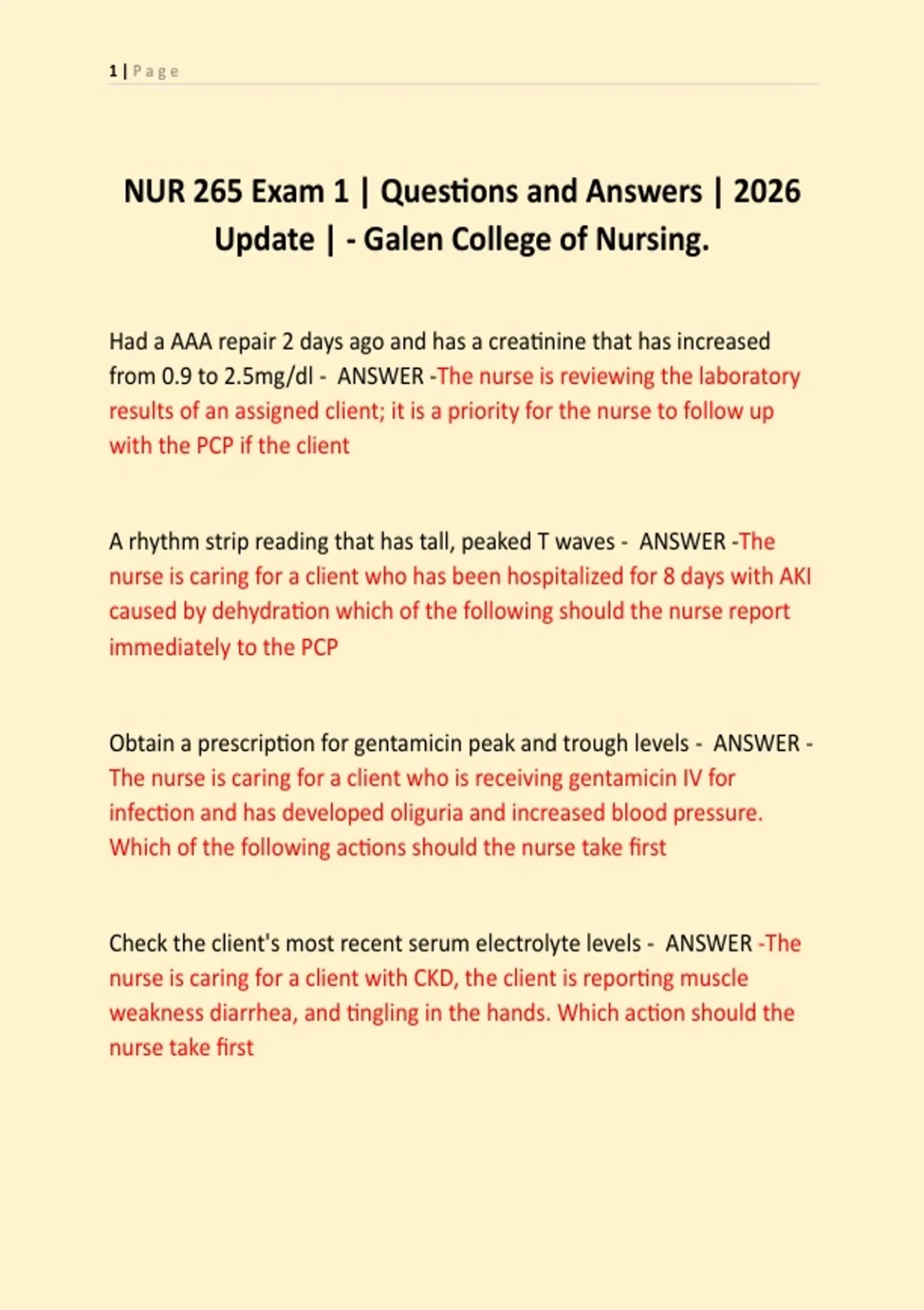 NUR 265 Exam 1 | Questions and Answers | 2026
