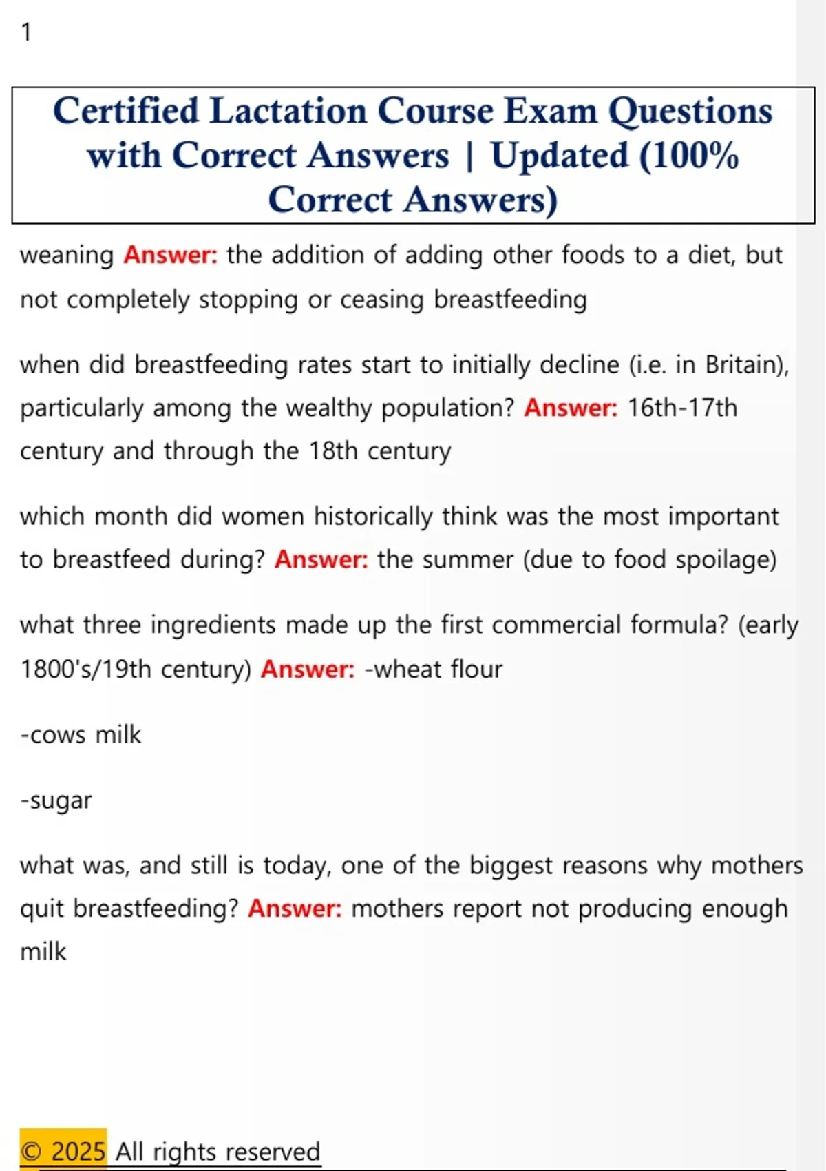Certified Lactation Course Exam Questions with Correct Answers | Updated (100% Correct Answers)