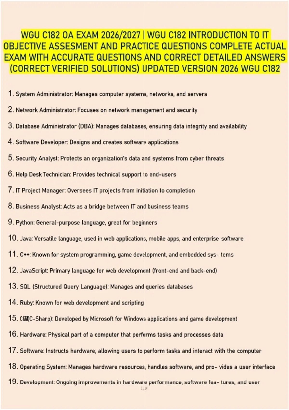 Master the technical evolution and professional landscape of the IT industry with this 2026/2027 Admin-focused exam bank for WGU C182. This resource features verified questions and answers that detail the progression of computing from vacuum tubes to Fifth Generation Ultra-Large-Scale Integration (ULSI) and future-leaning nanotechnology. You will gain technical clarity on the specific responsibilities of IT roles, from the hardware-focused System Administrator to the data-integrity-driven Database Administrator (DBA). The guide provides surgical detail on the primary use cases for major programming languages and the mechanical constraints of mechanosynthesis. From identifying internal CPU sequences to understanding the impact of molecular manufacturing on modern electronics, this toolkit ensures you possess the comprehensive knowledge required for a first-time pass on the Objective Assessment.