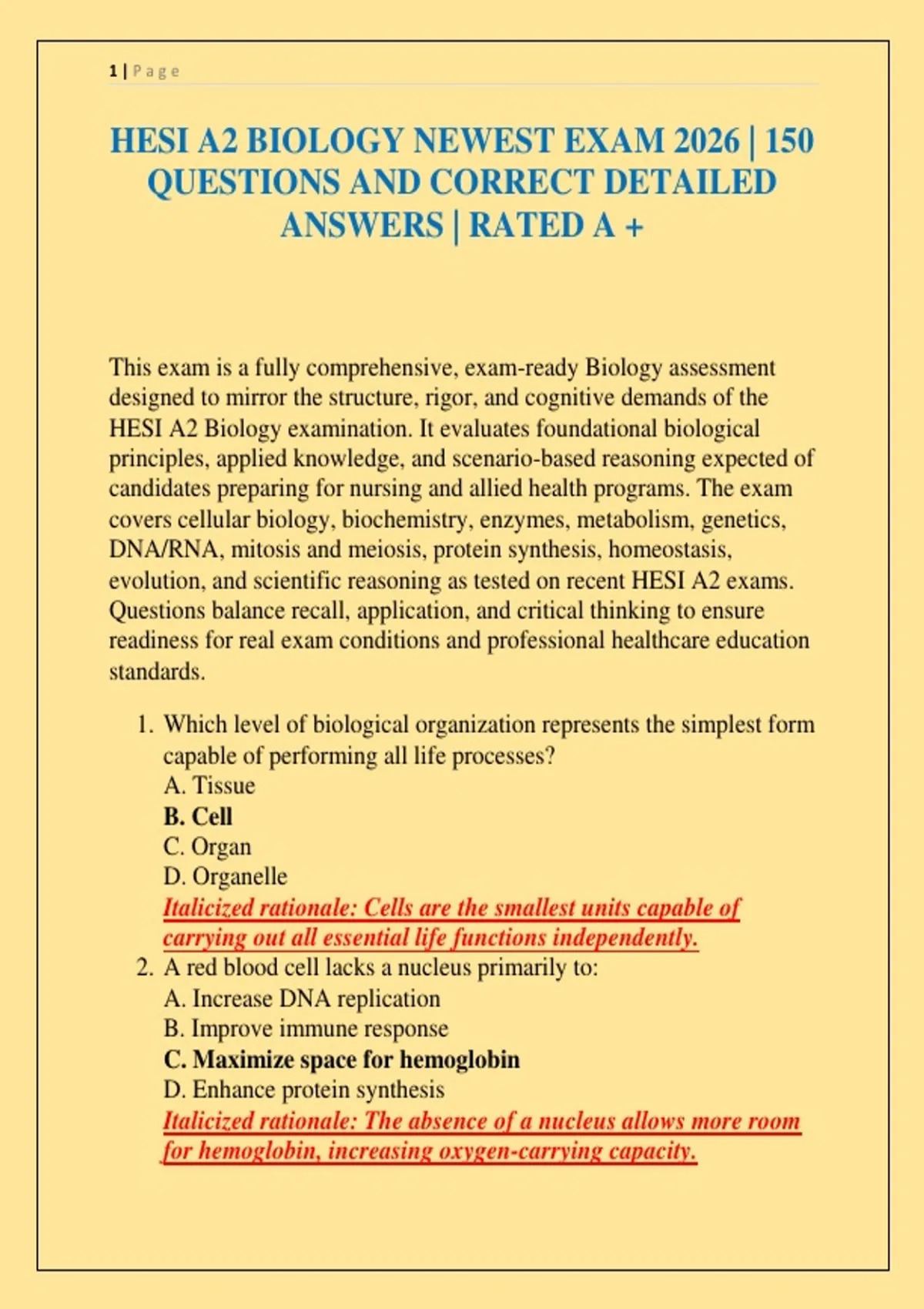 HESI A2 BIOLOGY NEWEST EXAM 2026 | 150 QUESTIONS AND CORRECT DETAILED ANSWERS | RATED A +