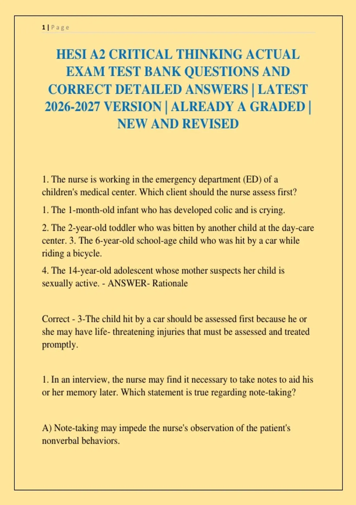 HESI A2 CRITICAL THINKING ACTUAL