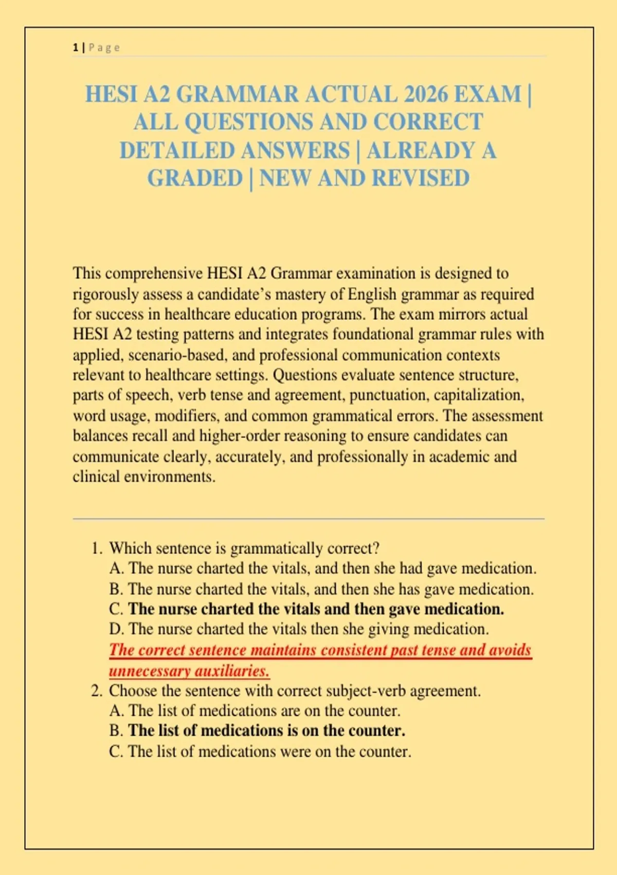 HESI A2 GRAMMAR ACTUAL 2026 EXAM | ALL QUESTIONS AND CORRECT DETAILED ANSWERS | ALREADY A GRADED | NEW AND REVISED