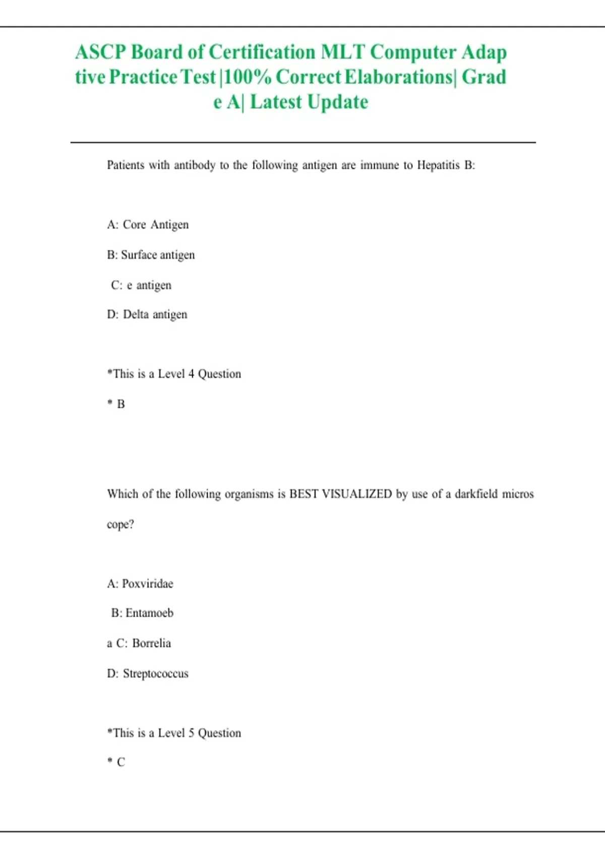 ASCP Board of Certification MLT Computer Adaptive Practice Test |100% Correct Elaborations| Grade A| Latest Update