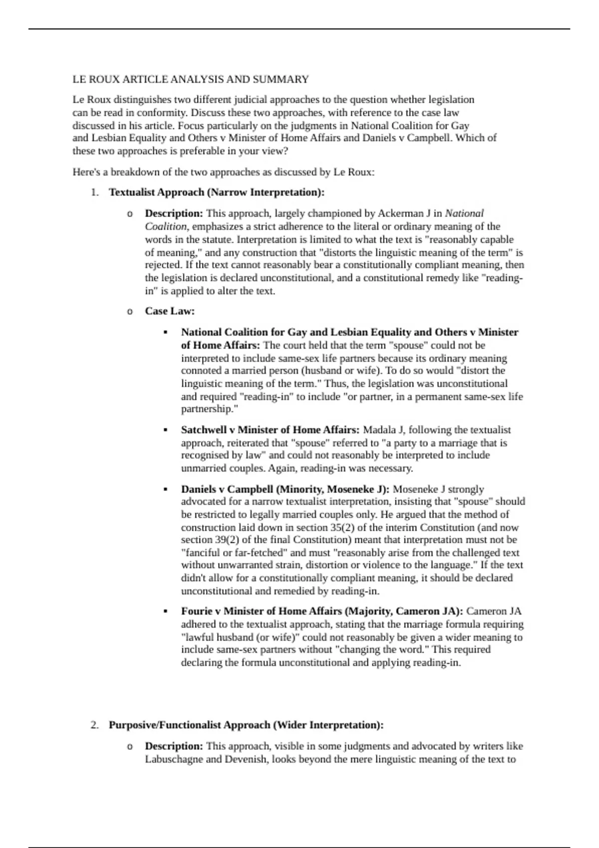 In depth analysis of the prescribed Le Roux article that is examined in first year law at Stellenbosch University.