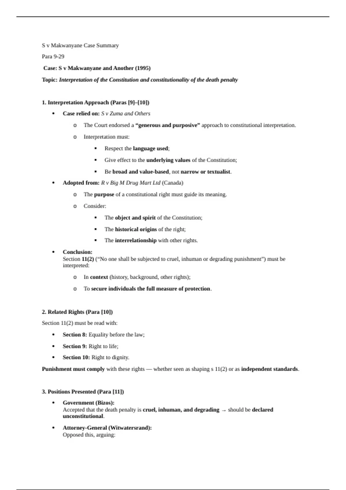 Summary and analysis of the prescribed and heavily examined case 'S v Makwanyane'. Written by a Stellenbosch student with an 85% Intro to Constitutional Law first year mark.