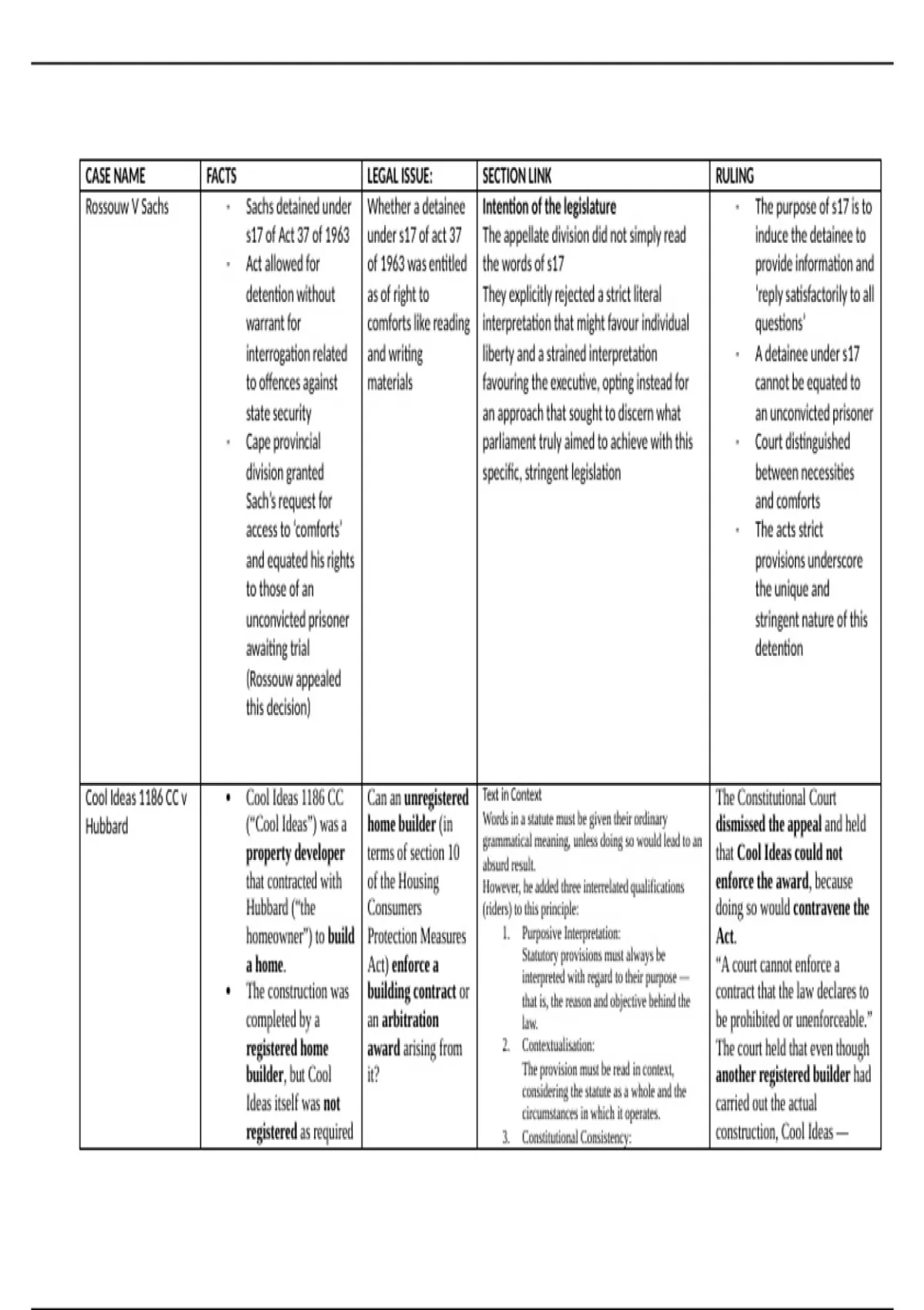 In depth table analysing and summarizing all of the prescribed cases for Intro to Constitutional Law and statutory Interpretation 178 at Stellenbosch University. Created by a Stellenbosch student who achieved an 85% average for intro to con law.