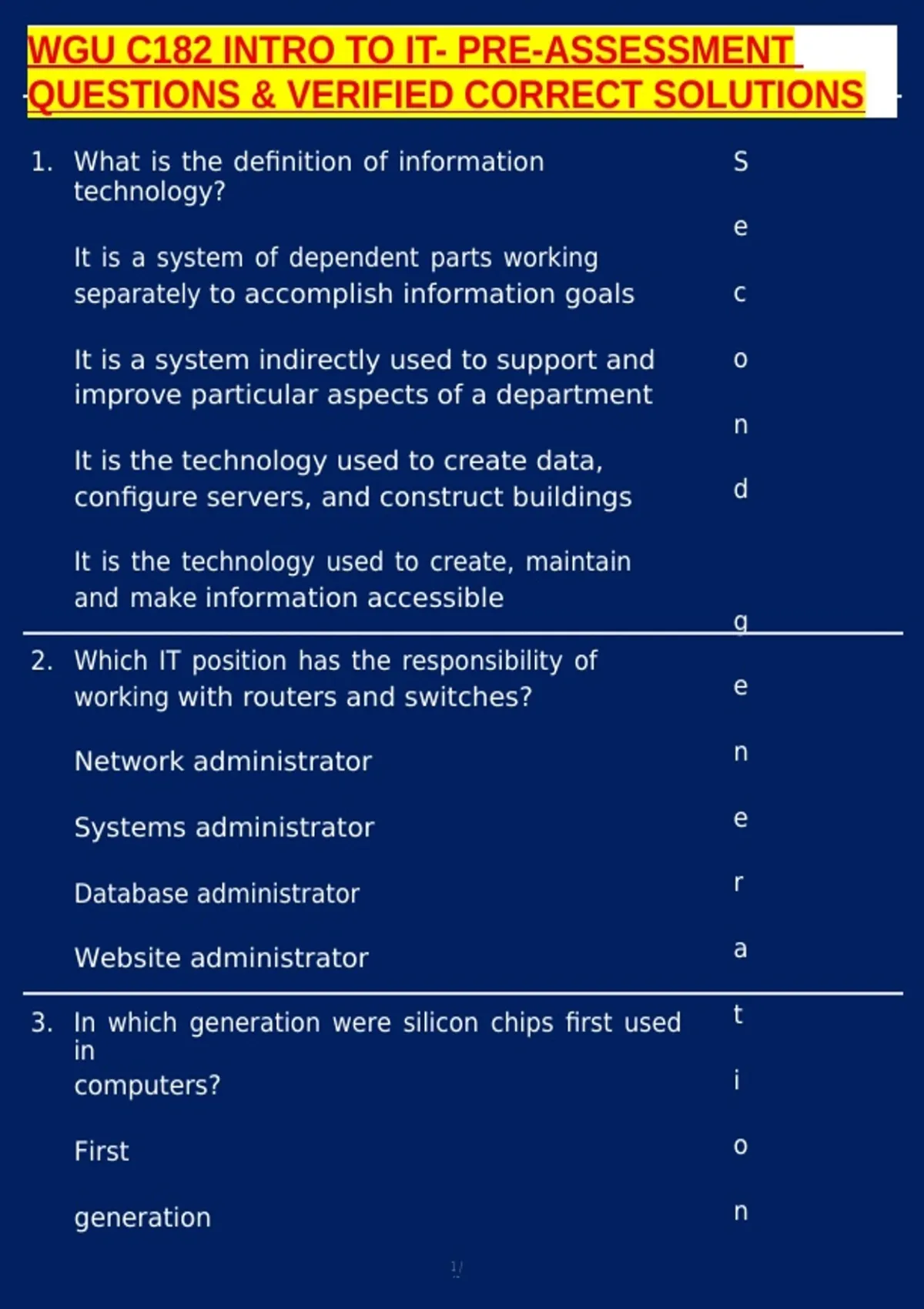 WGU C182 INTRO TO IT- PRE-ASSESSMENT QUESTIONS & VERIFIED CORRECT SOLUTIONS It’s designed to give students a broad understanding of the key areas within IT and how technology supports business and organizational goals.