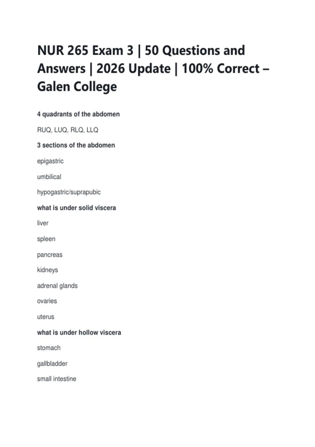 NUR 265 Exam 3 | 50 Questions and Answers | 2026 Update | 100% Correct Galen College