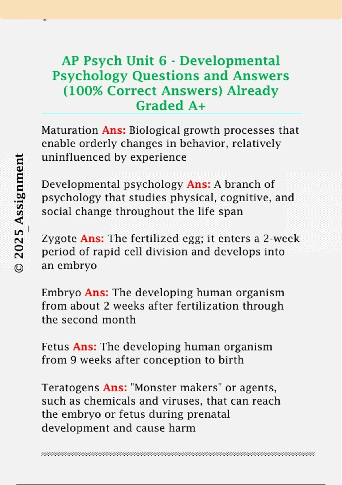 AP Psych Unit 6 - Developmental Psychology Questions and Answers (100% Correct Answers) Already Graded A+