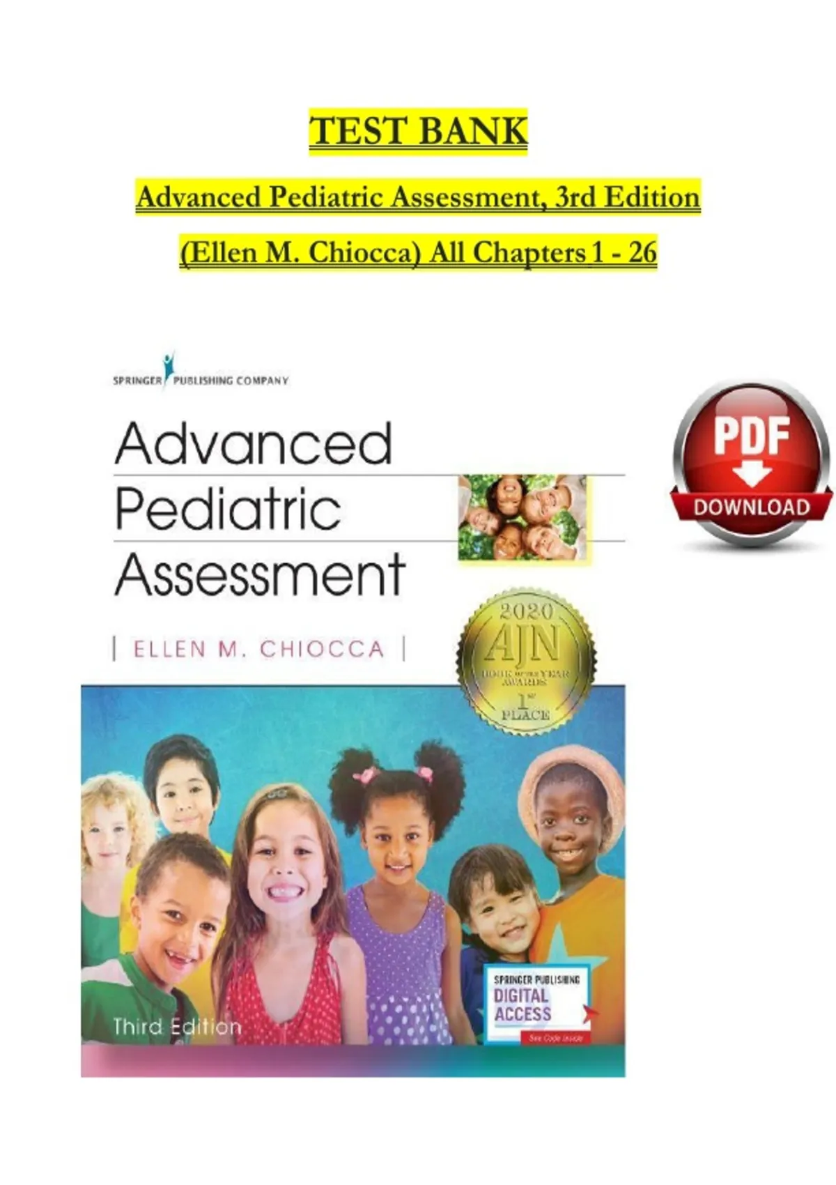 Prepare effectively for advanced pediatric nursing exams with this comprehensive Test Bank for Advanced Pediatric Assessment, 3rd Edition by Ellen M. Chiocca. Includes practice questions, verified answers, and rationales covering pediatric assessment techniques, growth and development evaluation, clinical findings interpretation, and care planning. Perfect for nursing students, pediatric nurse practitioners, and instructors seeking structured review, exam prep, and confidence in mastering pediatric assessment concepts. Ideal for homework help, quizzes, and final exam preparation.