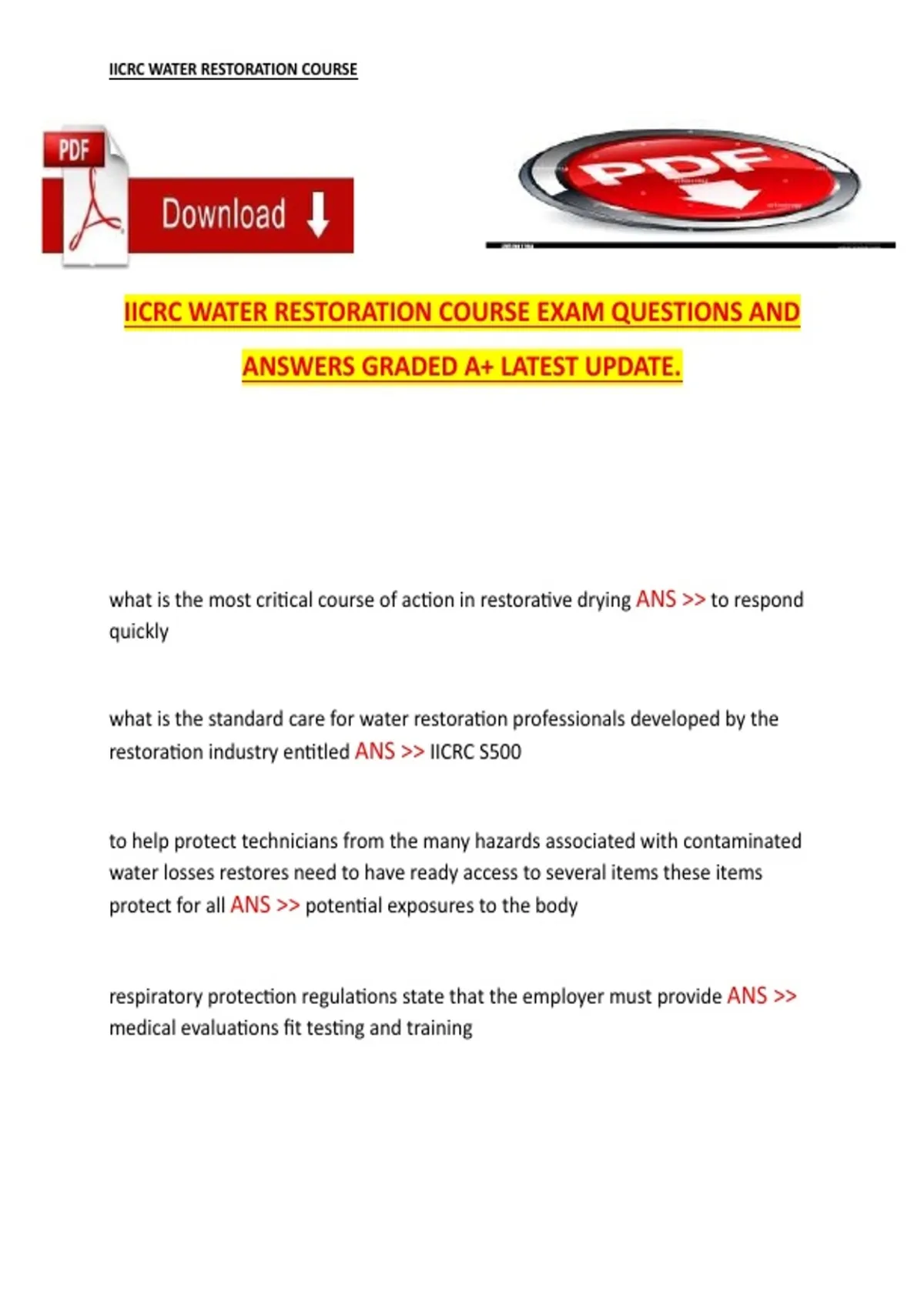 This document contains the latest IICRC Water Restoration course exam questions and answers, fully graded A+. It covers all essential topics in water damage restoration, including mitigation techniques, moisture detection, and mold remediation. The material is up-to-date and designed to help students and professionals achieve complete readiness for the certification exam.