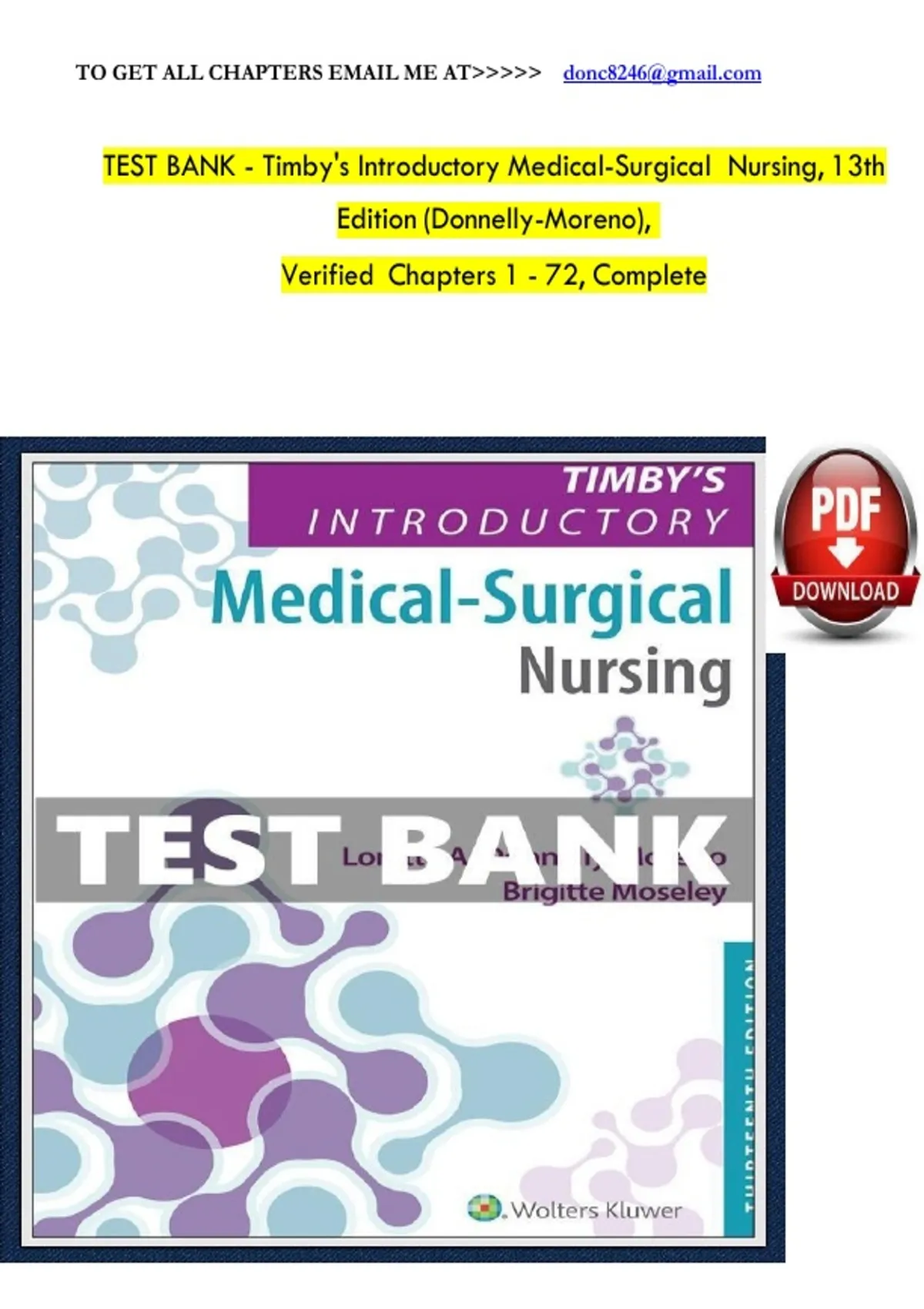 Timbys Introductory Medical-Surgical Nursing 13th Edition Donnelly Moreno Test Bank (All chapters complete, Answers Verified 100%)
