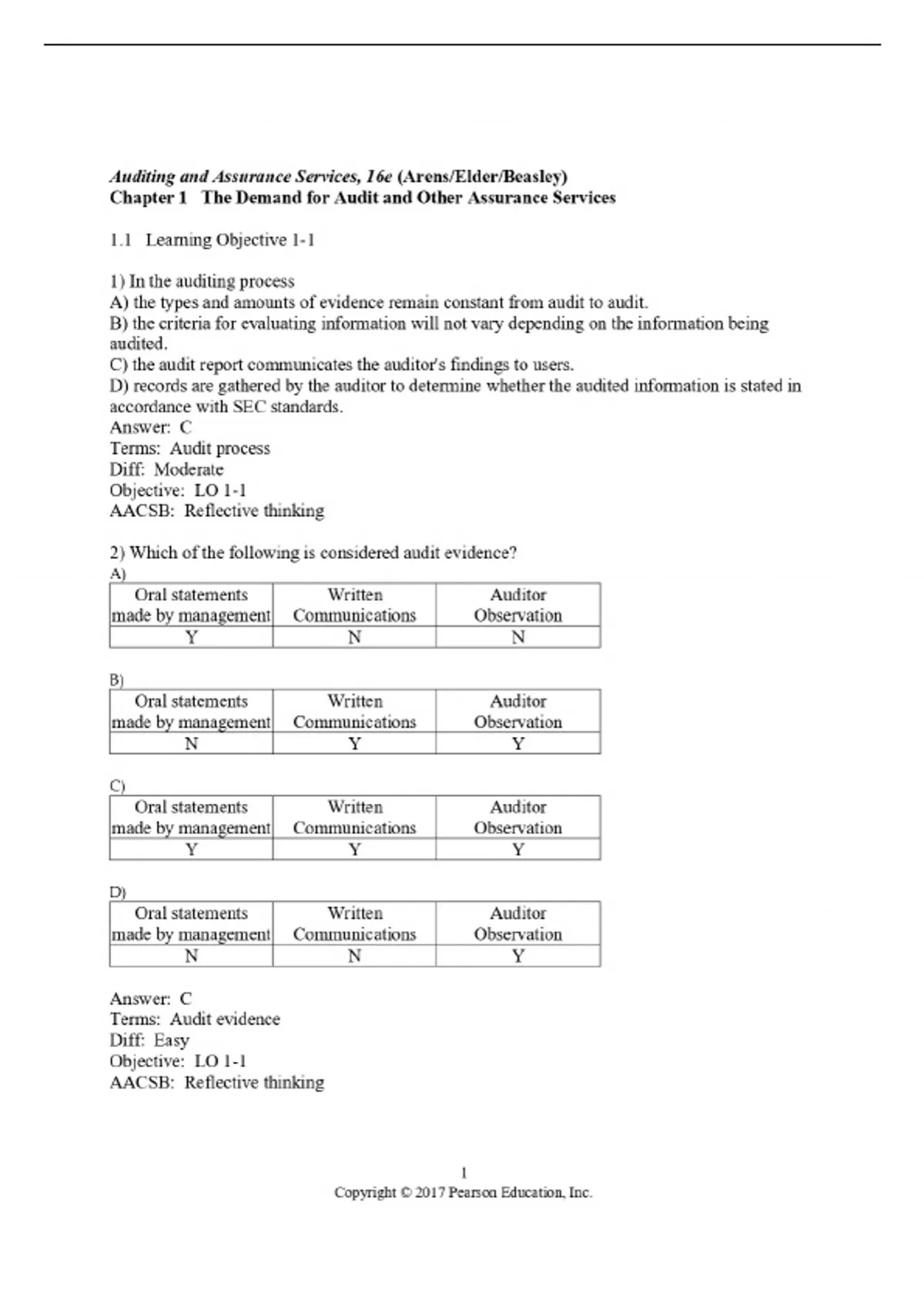 Auditing and Assurance Services 16th Edition Arens Test Bank, Questions and Answers - All Chapters. Part 1: The Auditing Profession Chapter 1: The Demand for Audit and Other Assurance Services Chapter 2: The CPA Profession Chapter 3: Audit Reports Chapter 4: Professional Ethics Chapter 5: Legal Liability Part 2: The Audit Process Chapter 6: Audit Responsibilities and Objectives Chapter 7: Audit Evidence Chapter 8: Audit Planning and Materiality Chapter 9: Assessing the Risk of Material Misstatement Chapter 10: Assessing and Responding to Fraud Risks Chapter 11: Internal Control and Coso Framework Chapter 12: Assessing Control Risk and Reporting on Internal Controls Chapter 13: Overall Audit Strategy and Audit Program Part 3: Application of the Audit Process to the Sales and Collection Cycle Chapter 14: Audit of the Sales and Collection Cycle: Tests of Controls and Substantive Tests of Transaction Chapter 15: Audit Sampling for Tests of Controls and Substantive Tests of Transactions Chapter 16: Completing the Tests in the Sales and Collection Cycle: Accounts Receivable Chapter 17: Audit Sampling for Tests of Details of Balances Part 4: Application of the Audit Process to Other Cycles Chapter 18: Audit of the Acquisition and Payment Cycle: Tests of Controls, Substantive Tests of Transactions, and Accounts Payable Chapter 19: Completing the Tests in the Acquisition and Payment Cycle: Verification of Selected Accounts Chapter 20: Audit of the Payroll and Personnel Cycle Chapter 21: Audit of the Inventory and Warehouse Cycle Chapter 22: Audit of the Capital Acquisition and Repayment Cycle Chapter 23: Audit of Cash and Financial Instruments Part 5: Completing the Audit Chapter 24: Completing the Audit Part 6: Other Assurance and Nonassurance Services Chapter 25: Other Assurance Services Chapter 26: Internal and Governmental Financial Auditing and Operational Auditing