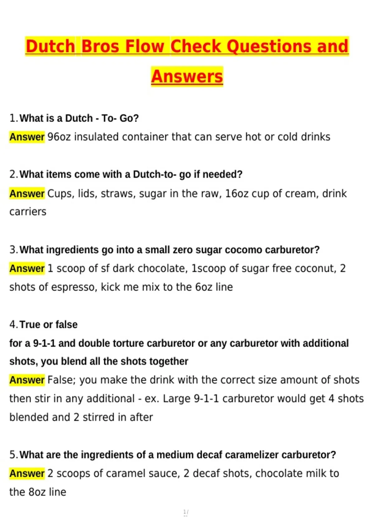Dutch Bros Flow check Test 2026 Actual Questions & Answers (Latest 2026 / 2027 Update) 100% Guarantee Pass (Verified Answers) Dutch Bros Manifesto Practice Quiz & Training Exam 2026 – Flow Test, Drinks Knowledge, and Employee Training Guide | INSTANT PDF DOWNLOAD Dutch Bros Manifesto 2026 practice quiz and training exam covers all key concepts, including the Dutch Bros flow process, drinks knowledge, and employee procedures. Designed for Dutch Bros crew training, it includes quizzes, flow checks, and full practice tests to prepare employees for certification and performance evaluations. Perfect for baristas, trainers, and staff seeking to master the Dutch Bros manifesto and maintain operational excellence. Available as an INSTANT PDF DOWNLOAD for immediate access