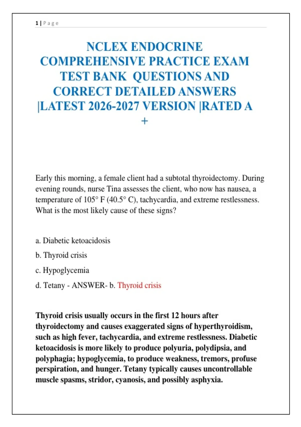 d. Tetany - ANSWER- b. Thyroid crisis