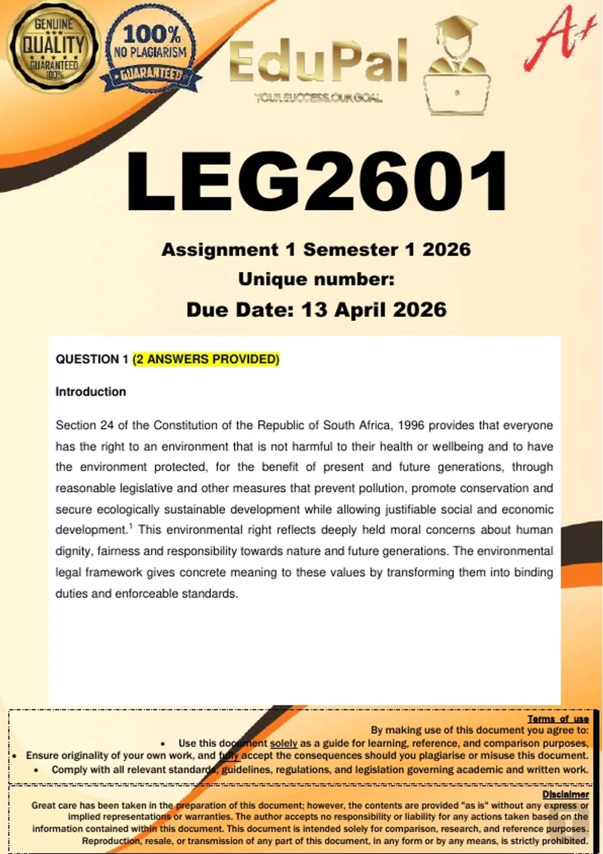 LEG2601 Assignment 1 (COMPLETE ANSWERS) Semester 1 2026 - DUE 13 April 2026; 100% TRUSTED Complete, trusted solutions and explanations. For assistance, Whats-App 0.6.7-1.7.1-1.7.3.9. Ensure your success with us... Critically evaluate how the environmental legal framework relates to morals and societal values. In your answer, explain how environmental law differs from other social norms (such as cultural practices and ethical behaviour) and how the environmental legal framework, as opposed to social norms, gives effect to the environmental right contained in South Africa’s Constitution.Critically evaluate how the environmental legal framework relates to morals and societal values. In your answer, explain how environmental law differs from other social norms (such as cultural practices and ethical behaviour) and how the environmental legal framework, as opposed to social norms, gives effect to the environmental right contained in South Africa’s Constitution.Critically evaluate how the environmental legal framework relates to morals and societal values. In your answer, explain how environmental law differs from other social norms (such as cultural practices and ethical behaviour) and how the environmental legal framework, as opposed to social norms, gives effect to the environmental right contained in South Africa’s Constitution.
