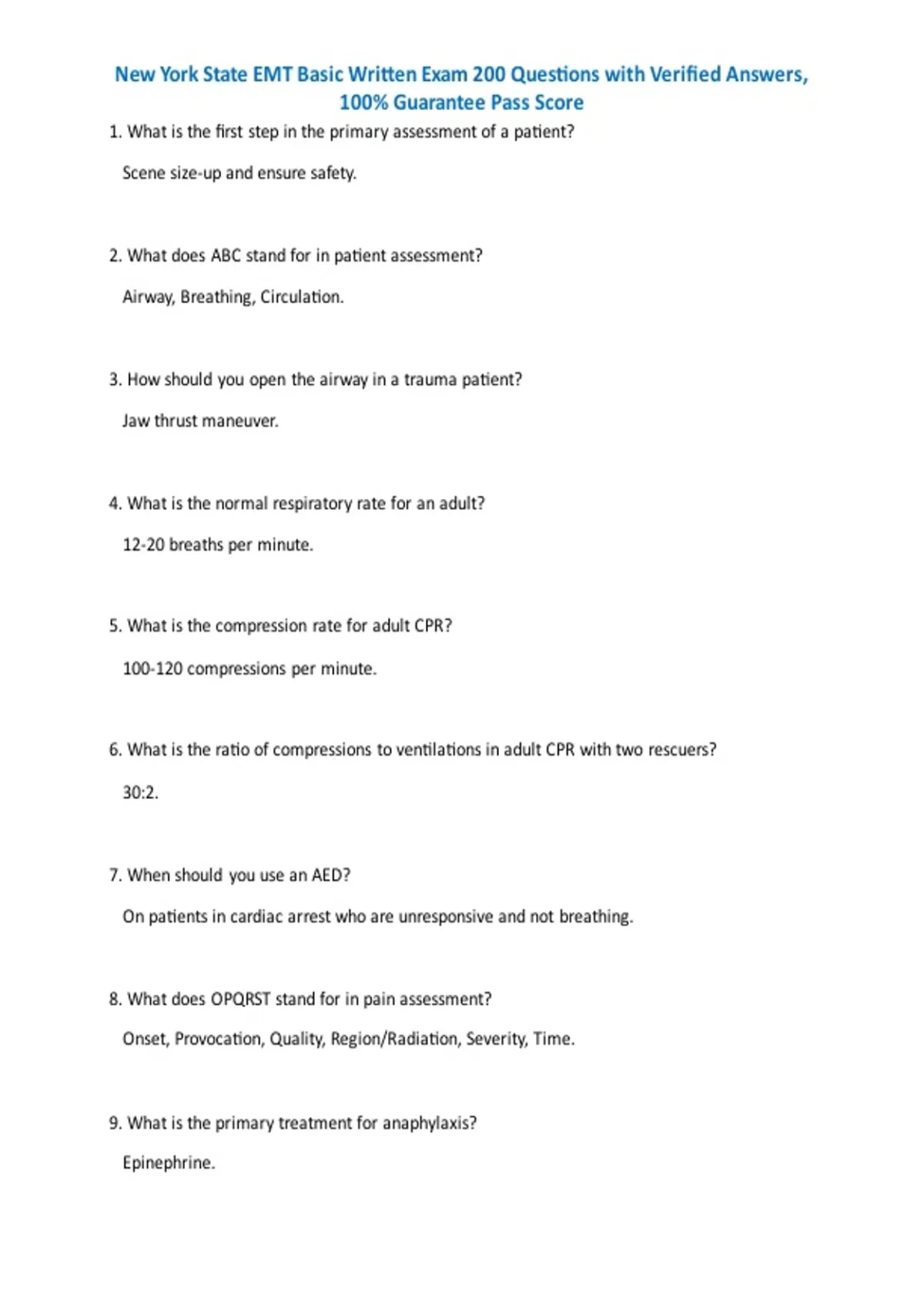 New York State EMT Basic Written Exam 200 Questions with Verified Answers,