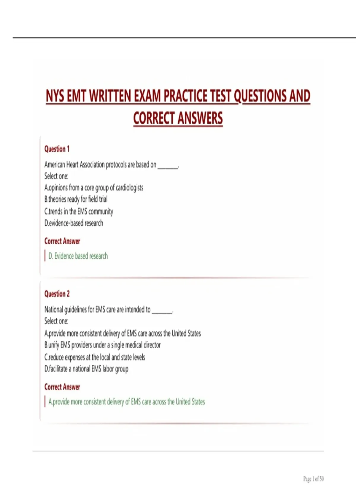 NYS EMT WRITTEN EXAM PRACTICE TEST QUESTIONS AND CORRECT ANSWERS