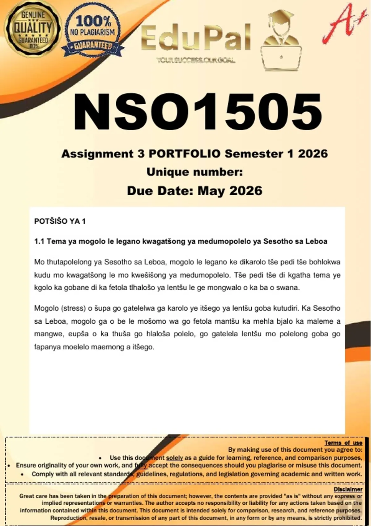 NSO1505 Asaenmente 3 POTFOLIO (COMPLETE ANSWERS) Semestere 1 2026 - DUE May 2026; 100% TRUSTED Complete, trusted solutions and explanations. For assistance, Whats-App 0.8.1..2.7.8..3.3.7.2... Ensure your success with us...... NSO1505/101/3/2022 Re hlalosetše ka botlalo tema ye e kgathwago ke mogolo le legano kwagatšong ya medumopolelo ya Sesotho sa Leboa. Tlhalošo ya gago e thekgwe ka mehlala ya meleba. Na go bohlokwa gore moithuti wa thutapolelo a tsebe go bala le go ngwala ka sefonetiki? Tia di lle. Sebopegotheo sa dinoko Sesothong sa Leboa ke CV-CV-CV. Le ge go le bjalo, go na le ditumanoši le ditumammogo tše di kgonago go ba dinoko ka botšona. NSO1505/101/3/2022 Ahlaala pego ye e lego mo godimo, o tšweletše mehlala ya maleba. Šomiša mantšu a a latelago go re laetša ka moo dihlogo le meselana di ka tlišago mahlakore a go fapana a tlhalošo modung o tee. Karabo ya gago e tšweletše maina a mabopi a o bolelago ka ona. moruti ba a bolela Hlalosa kgopolo ye: ‘kwano ka makgokedi’. Tšea mehlala magorontšung a go fapana go re kgodiša se o se hlalosago Re fe mehuta ye meraro ya mahlalosetšagotee gomme o re hlalosetše phapano ya tswalano gare ya mehuta yeo. Re fe dipara tše pedi tša malatodi tša mehuta ya go fapana gomme o hlalose mehuta yeo NSO1505/101/3/2026 . Potšišo 1 1.1 Hlaloša ka boripana karolo ye e bapalwago ke dithopolelo tše di nomorilwego (i) - (v) kwagatšong ya medumo ye e latelago: (a) [f] (b) [ß] (i) maswafo (ii) marakodu (iii) lešobakgokgokgo (iv) tengwana le mogolo (v) legano 1.2 Ngwala dikarolo tše hlano tše bohlokwa tša leleme tše di ka šomišwago mo kwagatšong ya medumopolelo, gomme, malebana le karolo ye nngwe le ye nngwe, o fe mohlala wa modumopolelo wo o kwagatšwago ka karolo yeo. (10) Potšišo 2 2.1 Hlaloša lereo le fonime, o thekga tlhalošo ya gago ka mehlala. (5) NSO1505/101/3/2026 2.2 Re hlalošetše tlholego ya diphetogomedumo tše di latelago gomme o thekge tlhalošo ya gago ka mehlala ya maleba. Hlokomela gore le ge mehlala ya gago o swanetše go e fa e le mantšu, o se lebale go tšweletša thwii gore ke medumo efe ye e amegago. (a) Thatafatšo (b) Poufatšo (c) Thinifatšo (d) Tumammogofatšo (20) Potšišo 3 Bala temana ye e latelago gomme o arabe dipotšišo tše di theilwego godimo ga yona: “O ka no tlogela (i) potšišo yela ya ka ge o sa rate go e araba. Naniki ba re o tšwele kotsing kua bookelong gomme o thomile go tielela (ii) ka lebelwana. Ka morago ga matšatši (iii) a mabedi goba a mararo o tla ba a kgona go bolela gomme o tla kgona go re botša dikarabo tša dipotšišo tše ntši tšeo gonabjale di re palelago go di araba. Bagwera ba gago le (iv) bona ba phafogile kua bookelong. Gosasa ba swanetše go tlo lala ba tonyetšwa ke samente mo,” a realo a lebantše Nakedi. “Bagwera ba ka bafe?” Nakedi a botšiša ka tlabego le kgakanego a tomotše mahlo go laetša gore ga a kwe seo se diregago le go se kwešiša. “Bona bale o ba tsebago. Ke maphodisa (v) a ba gobaditšego o šoro ge ba be ba leka go tšhaba.” (Bopape,HDN 1982: Lenong la gauta) NSO1505/101/3/2026 3.1 Re fe tše di latelago go tšwa temaneng ye o sa tšwago go e bala: (a) Magorontšu a mantšu ao a ngwadilwego ka bokoto. (10) (b) Lehlathafelo leo le bopilwego go tšwa leineng. (2) 3.2 Ngwala mantšu a linkwistiki ao a tšwelelago mo lefokong le gomme o be o ngwale maina a magorontšu a ona: Brenda ga se lehodu le le swerwego ka mošate. (8) 3.3 Hlaloša kgopolo ye ‘kwano ka makgokedi’. (5) NSO1505/101/3/2022 Re hlalosetše ka botlalo tema ye e kgathwago ke mogolo le legano kwagatšong ya medumopolelo ya Sesotho sa Leboa. Tlhalošo ya gago e thekgwe ka mehlala ya meleba. Na go bohlokwa gore moithuti wa thutapolelo a tsebe go bala le go ngwala ka sefonetiki? Tia di lle. Sebopegotheo sa dinoko Sesothong sa Leboa ke CV-CV-CV. Le ge go le bjalo, go na le ditumanoši le ditumammogo tše di kgonago go ba dinoko ka botšona. NSO1505/101/3/2022 Ahlaala pego ye e lego mo godimo, o tšweletše mehlala ya maleba. Šomiša mantšu a a latelago go re laetša ka moo dihlogo le meselana di ka tlišago mahlakore a go fapana a tlhalošo modung o tee. Karabo ya gago e tšweletše maina a mabopi a o bolelago ka ona. moruti ba a bolela Hlalosa kgopolo ye: ‘kwano ka makgokedi’. Tšea mehlala magorontšung a go fapana go re kgodiša se o se hlalosago Re fe mehuta ye meraro ya mahlalosetšagotee gomme o re hlalosetše phapano ya tswalano gare ya mehuta yeo. Re fe dipara tše pedi tša malatodi tša mehuta ya go fapana gomme o hlalose mehuta yeo NSO1505/101/3/2026 . Potšišo 1 1.1 Hlaloša ka boripana karolo ye e bapalwago ke dithopolelo tše di nomorilwego (i) - (v) kwagatšong ya medumo ye e latelago: (a) [f] (b) [ß] (i) maswafo (ii) marakodu (iii) lešobakgokgokgo (iv) tengwana le mogolo (v) legano 1.2 Ngwala dikarolo tše hlano tše bohlokwa tša leleme tše di ka šomišwago mo kwagatšong ya medumopolelo, gomme, malebana le karolo ye nngwe le ye nngwe, o fe mohlala wa modumopolelo wo o kwagatšwago ka karolo yeo. (10) Potšišo 2 2.1 Hlaloša lereo le fonime, o thekga tlhalošo ya gago ka mehlala. (5) NSO1505/101/3/2026 2.2 Re hlalošetše tlholego ya diphetogomedumo tše di latelago gomme o thekge tlhalošo ya gago ka mehlala ya maleba. Hlokomela gore le ge mehlala ya gago o swanetše go e fa e le mantšu, o se lebale go tšweletša thwii gore ke medumo efe ye e amegago. (a) Thatafatšo (b) Poufatšo (c) Thinifatšo (d) Tumammogofatšo (20) Potšišo 3 Bala temana ye e latelago gomme o arabe dipotšišo tše di theilwego godimo ga yona: “O ka no tlogela (i) potšišo yela ya ka ge o sa rate go e araba. Naniki ba re o tšwele kotsing kua bookelong gomme o thomile go tielela (ii) ka lebelwana. Ka morago ga matšatši (iii) a mabedi goba a mararo o tla ba a kgona go bolela gomme o tla kgona go re botša dikarabo tša dipotšišo tše ntši tšeo gonabjale di re palelago go di araba. Bagwera ba gago le (iv) bona ba phafogile kua bookelong. Gosas