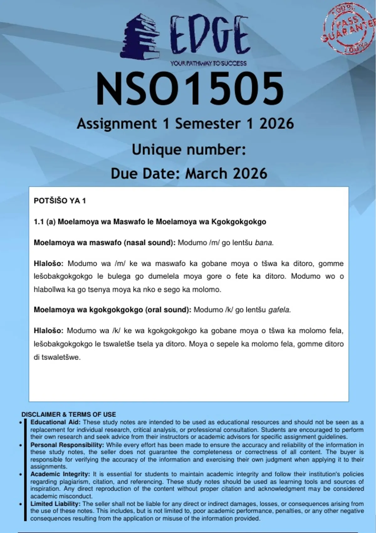 Comprehensively structured NSO1505 Assignment 1 (ANSWERS) Semester 1 2026 - DISTINCTION GUARANTEED. Prepared to a distinction standard with detailed and well-developed responses... Bala temana ye e lego mo fase gomme o arabe dipotšišo tše di latelago, go tšwa mo go yona: Ya re ge Jakobo a lebelela a iša mahlo kua pele, a bona go fihla Esau a na le banna ba makgolo a mane. Jakobo a napa a arola bana ba gagwe, a ba gafela Lea, a ba gafela Rahele le balata bale ba bona. (Genesi 33:1, Bibele 1951) NSO1505/101/3/2024 Kgetha modumo o tee wa moelamoya wa maswafo le o tee wa moelamoya wa kgokgokgo gomme o hlaloše boemo bja lešobakgokgokgo mabapi le medumo yeo o e kgethilego. Kgetha tumathunyigwaša e tee ya putšwetšo le e tee ya go hloka putšwetšo. (Ngwala mantšu a a latelago ka sefonetiki: kgokgokgo medumo Kgetha tumanoši e tee ye e hlatlošitšwego kua temaneng gomme o e ngwale. Thala papetla ya boemo bja leleme mabapi le ditumanoši tša motheo fela. NSO1505/101/3/2024 Ka mehlala ya maleba hlaloša gore o kwešiša eng ka dikgopolo tše di latelago mabapi le kwagatšo ya medumo: tlhabošo ya ka mehla tlhabošo ye e sego ya ka mehla Ahlaahla peakanyo ya motheo ya dinoko Sesothong sa Leboa, o be o re laetše medumo ye e kgonago go ba dinoko ka boyona. Thekga karabo ya gago ke mehlala ya maleba. Re fe maina a diphetogomedumo tše di hlolegilego mantšung goba dikarolontšung tše di latelago gomme o bontšhe le medumo ye e amegilego. Araba bjalo: (aa) tengwanafatšo: [m] [ŋ] GOBA m ng Ke go re: leina la phetogomodumo ke tengwafatšo, gomme [m] e fetogile [ŋ]) rara rra -ruta thuto pere pešana tshipi tshitswana -tsena -tsenya Bala temana ye e latelago gomme o arabe dipotšišo tše di theilwego godimo ga yona: “O ka no tlogela (i) potšišo yela ya ka ge o sa rate go e araba. Naniki ba re o tšwele kotsing kua bookelong gomme o thomile go tielela (ii) ka lebelwana. Ka morago ga matšatši (iii) a mabedi goba a mararo o tla ba a kgona go bolela gomme o tla kgona go re botša dikarabo tša dipotšišo tše ntši tšeo gonabjale di re palelago go di araba. Bagwera ba gago le (iv) bona ba phafogile kua bookelong. Gosasa ba swanetše go tlo lala ba tonyetšwa ke samente mo,” a realo a lebantše Nakedi. “Bagwera ba ka bafe?” Nakedi a botšiša ka tlabego le kgakanego a tomotše mahlo go laetša gore ga a kwe seo se diregago le go se kwešiša. “Bona bale o ba tsebago. Ke maphodisa (v) a ba gobaditšego o šoro ge ba be ba leka go tšhaba.” (Bopape,HDN 1982: Lenong la gauta) NSO1505/101/3/2026 1.1 Re fe tše di latelago go tšwa temaneng ye o sa tšwago go e bala: (a) Magorontšu a mantšu ao a ngwadilwego ka bokoto. (10) (b) Lehlathafelo leo le bopilwego go tšwa leineng. (2) 1.2 Ngwala mantšu a linkwistiki ao a tšwelelago mo lefokong le gomme o be o ngwale maina a magorontšu a ona: Brenda ga se lehodu le le swerwego ka mošate. (8) 1.3 Hlaloša kgopolo ye ‘kwano ka makgokedi’. (5) 2.1 Mantšu a a latelago ke dipara tša malatodi. Re hlalošetše gore o bona bolatodi bja gona bo fapana bjang, o be o oketše ka mehlala ye e sego ka fase ga ye mebedi mohuteng yo mongwe le wo mongwe: (a) godimo X fase (b) -reka X -rekiša (15) NSO1505/101/3/2026 2.2 Efa mohlala ye mebedi ye mebedi ya mareo go ya ka ditheo tše di latelago tša popego ya mareo: (a) Tšhutišo ya tlhalošo (b) Pokantšho (c) Kadimo (d) Akronimi (e) Tlhamo ya mantšu a mafsa (10) Bala temana ye e lego mo fase gomme o arabe dipotšišo tše di latelago, go tšwa mo go yona: Ya re ge Jakobo a lebelela a iša mahlo kua pele, a bona go fihla Esau a na le banna ba makgolo a mane. Jakobo a napa a arola bana ba gagwe, a ba gafela Lea, a ba gafela Rahele le balata bale ba bona. (Genesi 33:1, Bibele 1951) NSO1505/101/3/2024 Kgetha modumo o tee wa moelamoya wa maswafo le o tee wa moelamoya wa kgokgokgo gomme o hlaloše boemo bja lešobakgokgokgo mabapi le medumo yeo o e kgethilego. Kgetha tumathunyigwaša e tee ya putšwetšo le e tee ya go hloka putšwetšo. (Ngwala mantšu a a latelago ka sefonetiki: kgokgokgo medumo Kgetha tumanoši e tee ye e hlatlošitšwego kua temaneng gomme o e ngwale. Thala papetla ya boemo bja leleme mabapi le ditumanoši tša motheo fela. NSO1505/101/3/2024 Ka mehlala ya maleba hlaloša gore o kwešiša eng ka dikgopolo tše di latelago mabapi le kwagatšo ya medumo: tlhabošo ya ka mehla tlhabošo ye e sego ya ka mehla Ahlaahla peakanyo ya motheo ya dinoko Sesothong sa Leboa, o be o re laetše medumo ye e kgonago go ba dinoko ka boyona. Thekga karabo ya gago ke mehlala ya maleba. Re fe maina a diphetogomedumo tše di hlolegilego mantšung goba dikarolontšung tše di latelago gomme o bontšhe le medumo ye e amegilego. Araba bjalo: (aa) tengwanafatšo: [m] [ŋ] GOBA m ng Ke go re: leina la phetogomodumo ke tengwafatšo, gomme [m] e fetogile [ŋ]) rara rra -ruta thuto pere pešana tshipi tshitswana -tsena -tsenya Bala temana ye e latelago gomme o arabe dipotšišo tše di theilwego godimo ga yona: “O ka no tlogela (i) potšišo yela ya ka ge o sa rate go e araba. Naniki ba re o tšwele kotsing kua bookelong gomme o thomile go tielela (ii) ka lebelwana. Ka morago ga matšatši (iii) a mabedi goba a mararo o tla ba a kgona go bolela gomme o tla kgona go re botša dikarabo tša dipotšišo tše ntši tšeo gonabjale di re palelago go di araba. Bagwera ba gago le (iv) bona ba phafogile kua bookelong. Gosasa ba swanetše go tlo lala ba tonyetšwa ke samente mo,” a realo a lebantše Nakedi. “Bagwera ba ka bafe?” Nakedi a botšiša ka tlabego le kgakanego a tomotše mahlo go laetša gore ga a kwe seo se diregago le go se kwešiša.