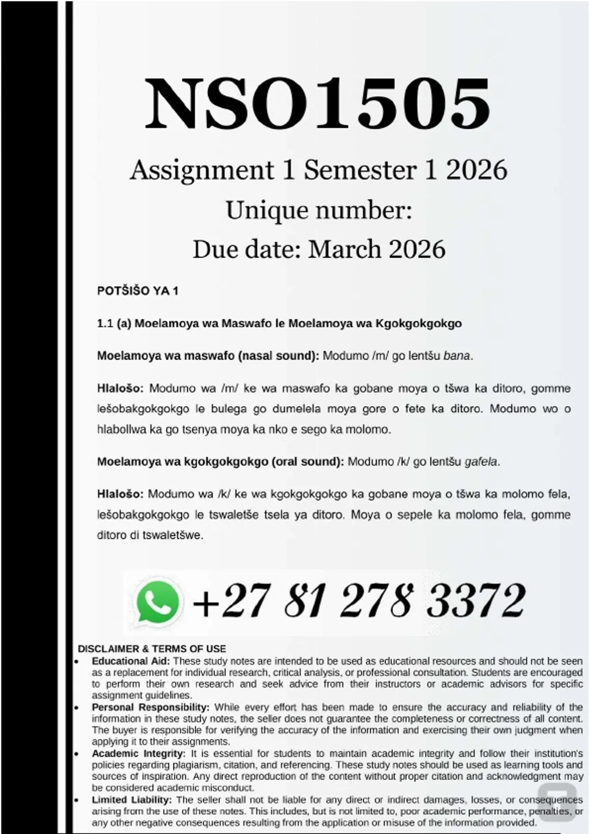 NSO1505 Assignment 1 (COMPLETE ANSWERS) Semester 1 2026 - DUE March 2026... Bala temana ye e lego mo fase gomme o arabe dipotšišo tše di latelago, go tšwa mo go yona: Ya re ge Jakobo a lebelela a iša mahlo kua pele, a bona go fihla Esau a na le banna ba makgolo a mane. Jakobo a napa a arola bana ba gagwe, a ba gafela Lea, a ba gafela Rahele le balata bale ba bona. (Genesi 33:1, Bibele 1951) NSO1505/101/3/2024 Kgetha modumo o tee wa moelamoya wa maswafo le o tee wa moelamoya wa kgokgokgo gomme o hlaloše boemo bja lešobakgokgokgo mabapi le medumo yeo o e kgethilego. Kgetha tumathunyigwaša e tee ya putšwetšo le e tee ya go hloka putšwetšo. (Ngwala mantšu a a latelago ka sefonetiki: kgokgokgo medumo Kgetha tumanoši e tee ye e hlatlošitšwego kua temaneng gomme o e ngwale. Thala papetla ya boemo bja leleme mabapi le ditumanoši tša motheo fela. NSO1505/101/3/2024 Ka mehlala ya maleba hlaloša gore o kwešiša eng ka dikgopolo tše di latelago mabapi le kwagatšo ya medumo: tlhabošo ya ka mehla tlhabošo ye e sego ya ka mehla Ahlaahla peakanyo ya motheo ya dinoko Sesothong sa Leboa, o be o re laetše medumo ye e kgonago go ba dinoko ka boyona. Thekga karabo ya gago ke mehlala ya maleba. Re fe maina a diphetogomedumo tše di hlolegilego mantšung goba dikarolontšung tše di latelago gomme o bontšhe le medumo ye e amegilego. Araba bjalo: (aa) tengwanafatšo: [m] [ŋ] GOBA m ng Ke go re: leina la phetogomodumo ke tengwafatšo, gomme [m] e fetogile [ŋ]) rara rra -ruta thuto pere pešana tshipi tshitswana -tsena -tsenya Bala temana ye e latelago gomme o arabe dipotšišo tše di theilwego godimo ga yona: “O ka no tlogela (i) potšišo yela ya ka ge o sa rate go e araba. Naniki ba re o tšwele kotsing kua bookelong gomme o thomile go tielela (ii) ka lebelwana. Ka morago ga matšatši (iii) a mabedi goba a mararo o tla ba a kgona go bolela gomme o tla kgona go re botša dikarabo tša dipotšišo tše ntši tšeo gonabjale di re palelago go di araba. Bagwera ba gago le (iv) bona ba phafogile kua bookelong. Gosasa ba swanetše go tlo lala ba tonyetšwa ke samente mo,” a realo a lebantše Nakedi. “Bagwera ba ka bafe?” Nakedi a botšiša ka tlabego le kgakanego a tomotše mahlo go laetša gore ga a kwe seo se diregago le go se kwešiša. “Bona bale o ba tsebago. Ke maphodisa (v) a ba gobaditšego o šoro ge ba be ba leka go tšhaba.” (Bopape,HDN 1982: Lenong la gauta) NSO1505/101/3/2026 1.1 Re fe tše di latelago go tšwa temaneng ye o sa tšwago go e bala: (a) Magorontšu a mantšu ao a ngwadilwego ka bokoto. (10) (b) Lehlathafelo leo le bopilwego go tšwa leineng. (2) 1.2 Ngwala mantšu a linkwistiki ao a tšwelelago mo lefokong le gomme o be o ngwale maina a magorontšu a ona: Brenda ga se lehodu le le swerwego ka mošate. (8) 1.3 Hlaloša kgopolo ye ‘kwano ka makgokedi’. (5) 2.1 Mantšu a a latelago ke dipara tša malatodi. Re hlalošetše gore o bona bolatodi bja gona bo fapana bjang, o be o oketše ka mehlala ye e sego ka fase ga ye mebedi mohuteng yo mongwe le wo mongwe: (a) godimo X fase (b) -reka X -rekiša (15) NSO1505/101/3/2026 2.2 Efa mohlala ye mebedi ye mebedi ya mareo go ya ka ditheo tše di latelago tša popego ya mareo: (a) Tšhutišo ya tlhalošo (b) Pokantšho (c) Kadimo (d) Akronimi (e) Tlhamo ya mantšu a mafsa (10) Bala temana ye e lego mo fase gomme o arabe dipotšišo tše di latelago, go tšwa mo go yona: Ya re ge Jakobo a lebelela a iša mahlo kua pele, a bona go fihla Esau a na le banna ba makgolo a mane. Jakobo a napa a arola bana ba gagwe, a ba gafela Lea, a ba gafela Rahele le balata bale ba bona. (Genesi 33:1, Bibele 1951) NSO1505/101/3/2024 Kgetha modumo o tee wa moelamoya wa maswafo le o tee wa moelamoya wa kgokgokgo gomme o hlaloše boemo bja lešobakgokgokgo mabapi le medumo yeo o e kgethilego. Kgetha tumathunyigwaša e tee ya putšwetšo le e tee ya go hloka putšwetšo. (Ngwala mantšu a a latelago ka sefonetiki: kgokgokgo medumo Kgetha tumanoši e tee ye e hlatlošitšwego kua temaneng gomme o e ngwale. Thala papetla ya boemo bja leleme mabapi le ditumanoši tša motheo fela. NSO1505/101/3/2024 Ka mehlala ya maleba hlaloša gore o kwešiša eng ka dikgopolo tše di latelago mabapi le kwagatšo ya medumo: tlhabošo ya ka mehla tlhabošo ye e sego ya ka mehla Ahlaahla peakanyo ya motheo ya dinoko Sesothong sa Leboa, o be o re laetše medumo ye e kgonago go ba dinoko ka boyona. Thekga karabo ya gago ke mehlala ya maleba. Re fe maina a diphetogomedumo tše di hlolegilego mantšung goba dikarolontšung tše di latelago gomme o bontšhe le medumo ye e amegilego. Araba bjalo: (aa) tengwanafatšo: [m] [ŋ] GOBA m ng Ke go re: leina la phetogomodumo ke tengwafatšo, gomme [m] e fetogile [ŋ]) rara rra -ruta thuto pere pešana tshipi tshitswana -tsena -tsenya Bala temana ye e latelago gomme o arabe dipotšišo tše di theilwego godimo ga yona: “O ka no tlogela (i) potšišo yela ya ka ge o sa rate go e araba. Naniki ba re o tšwele kotsing kua bookelong gomme o thomile go tielela (ii) ka lebelwana. Ka morago ga matšatši (iii) a mabedi goba a mararo o tla ba a kgona go bolela gomme o tla kgona go re botša dikarabo tša dipotšišo tše ntši tšeo gonabjale di re palelago go di araba. Bagwera ba gago le (iv) bona ba phafogile kua bookelong. Gosasa ba swanetše go tlo lala ba tonyetšwa ke samente mo,” a realo a lebantše Nakedi. “Bagwera ba ka bafe?” Nakedi a botšiša ka tlabego le kgakanego a tomotše mahlo go laetša gore ga a kwe seo se diregago le go se kwešiša.
