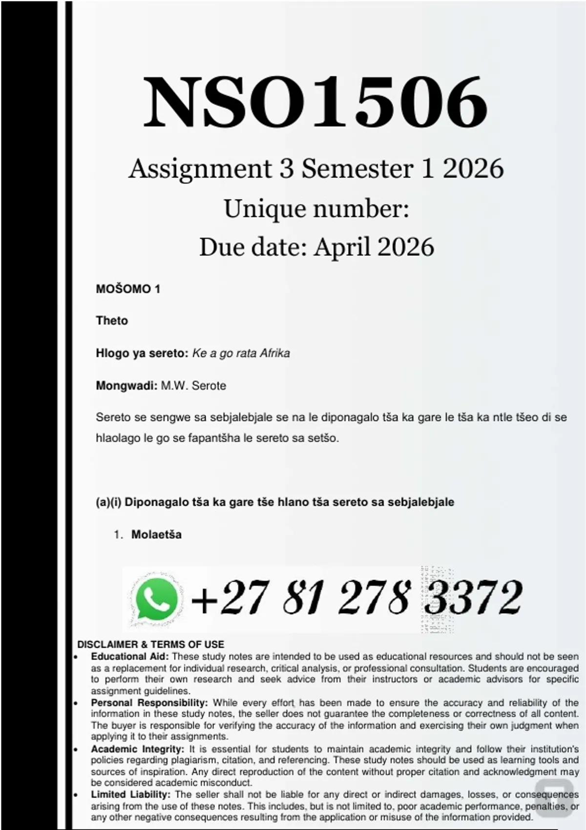NSO1506 Assignment 3 PORTFOLIO (COMPLETE ANSWERS) Semester 1 2026 - DUE May 2026... Ngwala thetotumišo ya sebjalebjale gomme o hlaloše tšeo di latelago mo go sona: Diponagalo tša ka gare tše hlano tša sereto seo. Diponagalo tša ka ntle tše hlano. Hlokomela: O se lebale go ngwala hlogo le mongwadi wa sereto sa gago Ngwala thetotumišo ya sebjalebjale gomme o hlaloše tšeo di latelago mo go sona: Diponagalo tša ka gare tše hlano tša sereto seo. Diponagalo tša ka ntle tše hlano. Hlokomela: O se lebale go ngwala hlogo le mongwadi wa sereto sa gago. Kanegelokopana e latela melawana yeo e itšego ge e ngwalwa. Bala ka ga kanegelokopana ka go Pukutlhahli ya SPE1506 gomme o ngwale kanegelokopana yeo e ka bago letlakala le tee ka e tee ya dihlogo tšeo di latelago: Boganka (bullying) ka dikolong Tšhomišo ya dinotagi ka baswa = Kokwanahloko ya Corona (COVID -19) Ngwala mehuta ye mene ya dinonwane o be o hlaloše mehola ye tshela (6) ya dinonwane. Dikošanathaloko tša bana di na le mehola, kudu kgodišong ya bana. Ngwala dikošanathaloko tša bana tše pedi gomme mafelelong a košanathaloko ye nngwe le ye nngwe o ngwale tše di latelago: Mohola wa košanathaloko Babapadi/Batšeakarolo Mokgwa wa go bapala košanathaloko yeo. Ngwala mohlala o tee wa montutuletšo. Direto di gobelwa le go retwa ke batho ba bagolo, le ge baswa le bona ba na le go di reta. Hlaloša mafelo a mahlano fao direto di ka retwago. Hlaloša diponagalo tša ka ntle tše hlano tša sereto. Dikapolelo di arotšwe ka mehuta yeo e fapanego. Ngwala mehuta ye mehlano ya dikapolelo o be o di hlaloše ka e tee ka e tee. Thulaganyo ya kanegelokopana ke ka mokgwa wo mongwadi a beakanyago ditiragalo go tšweletša kgopolo ya motheo. Hlaloša ka botlalo gore thulaganyo ke eng o be o ngwale dikarolo tše hlano tša Dinonwane Nonwane e na le sebopego seo se fapanago le sa dingwalo tše dingwe. Hlaloša sebopego sa nonwane ka botlalo Dikošana tša bana Hlaloša mehola ye mehlano ya dituntuletšo. Hlaloša mehola ye mehlano ya dikošanathaloko tša bana Bala sereto se gomme o fetole dipotšišo tšeo di latelago: Folaga ye Ka Mapule Ramaila Moswane Ka sebopego ke khutlotharo E laetša gore re tšwa kae, re ya kae. E laetša le gore re bomang. E phaphasela lefaufaung ka go lokologa. Ditsela re tšwelela ka tša go fapana Mafelelong ra sepelela go kopana. Go thoma go laetša go hloka kholofelo. Dipelo di swiswetše e le lehutšo le kaka legonono. Ra re ge re gopola gore re duletše lehumo la meepo Digauta, dipholathinamo, ditaamane le tše dingwe. Ge re gopola gore mašemong a rena ke mo go tšwago lehumo, Ra aparelwa ke lethabo dipelo ya ba tše tšhwaana. Sebopego sa Y se šupa gore go ya ka magoro Ga se go tšwana melato yona re tla rerišana. Folaga ya Afrika Borwa kgohlagano ya setšhaba. Folaga ye e rekilwe ka megogoma ya bana ba batho. Folaga ye ke tokologo, ke temokrasi. Folaga ye bahu ba hwile ba e llela ba e hlokile. Folaga ye a re swareng gabotse e se re tšwe ka diatleng. Folaga ye ke bohwa bja rena, boikgantšho bja rena. (Go tšwa pukung ya ditlhopho tša direto ya Bohwa bja segagešo letlakala 28) Ngwala kakaretšo le molaetša wa sereto seo se lego ka godimo. Bangwadi ba direto ba na le setaele sa bona sa go ngwala diema. Ngwala seema seo se lego temathetong ya bone, mothalothetong wa mathomo le wa bobedi ka tshwanelo/gabotse. Laetša morumokwano wo o lego gona mo temathetong ya bone o be o hlaloše gore ke mohuta ofe wa morumokwano. Hlaloša lereo le ‘kelelathalo’ o be o ngwale mohlala go tšwa seretong sa ka godimo Hlaloša mareo ao a latelago a kanegelokopana: Thulano Tikologo Kgwekgwe Ngwala mehuta ye mene ya dinonwane o be o di hlaloše ka bokopana. Nonwane e na le fomula yeo e ngwalwago ka yona. Ngwala matseno le bofelo bja nonwane. Ngwala košanathaloko ya bana e tee o be o hlaloše mohola wa yona.Hlokomela gore o se ngwale tšeo di lego ka go Pukutlhahlo Direto di gobelwa le go retwa ke batho ba bagolo, le ge baswa le bona ba na le go di reta. Hlaloša mafelo a mahlano fao direto di ka retwago. Hlaloša diponagalo tša ka ntle tše hlano tša sereto. Dikapolelo di arotšwe ka mehuta yeo e fapanego. Ngwala mehuta ye mehlano ya dikapolelo o be o di hlaloše ka e tee ka e tee. Thulaganyo ya kanegelokopana ke ka mokgwa wo mongwadi a beakanyago ditiragalo go tšweletša kgopolo ya motheo. Hlaloša ka botlalo gore thulaganyo ke eng o be o ngwale dikarolo tše hlano tša Dinonwane Nonwane e na le sebopego seo se fapanago le sa dingwalo tše dingwe. Hlaloša sebopego sa nonwane ka botlalo Dikošana tša bana Hlaloša mehola ye mehlano ya dituntuletšo. Hlaloša mehola ye mehlano ya dikošanathaloko tša bana Bala sereto se gomme o fetole dipotšišo tšeo di latelago: Folaga ye Ka Mapule Ramaila Moswane Ka sebopego ke khutlotharo E laetša gore re tšwa kae, re ya kae. E laetša le gore re bomang. E phaphasela lefaufaung ka go lokologa. Ditsela re tšwelela ka tša go fapana Mafelelong ra sepelela go kopana. Go thoma go laetša go hloka kholofelo. Dipelo di swiswetše e le lehutšo le kaka legonono. Ra re ge re gopola gore re duletše lehumo la meepo Digauta, dipholathinamo, ditaamane le tše dingwe. Ge re gopola gore mašemong a rena ke mo go tšwago lehumo, Ra aparelwa ke lethabo dipelo ya ba tše tšhwaana. Sebopego sa Y se šupa gore go ya ka magoro Ga se go tšwana melato yona re tla rerišana. Folaga ya Afrika Borwa kgohlagano ya setšhaba. Folaga ye e rekilwe ka megogoma ya bana ba batho. Folaga ye ke tokologo, ke temokrasi. Folaga ye bahu ba hwile ba e llela ba e hlokile. Folaga ye a re swareng gabotse e se re tšwe ka diatleng. Folaga ye ke bohwa bja rena, boikgantšho bja rena. (Go tšwa pukung ya ditlhopho tša direto ya Bohwa bja segagešo letlakala 28) Ngwala kakaretšo le molaetša wa sereto seo se lego ka godimo. Bangwadi ba direto ba na le setaele sa bona sa go ngwala diema. Ngwala seema seo se lego temathetong ya bone, mothalothetong wa mathomo le wa bobedi ka tshwanelo/gabotse. Laetša morum