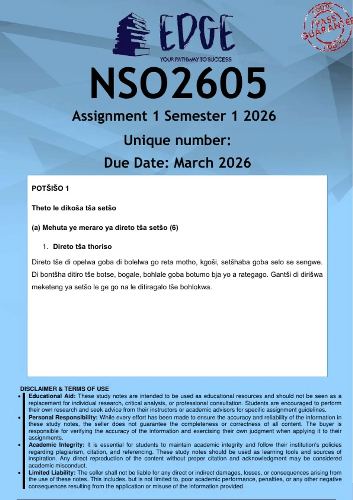 Comprehensively structured NSO2605 Assignment 1 (ANSWERS) Semester 1 2026 - DISTINCTION GUARANTEED. Prepared to a distinction standard with detailed and well-developed responses.... Direto le dikoša tša setšo di ka retwa le go opelwa mafelong le mabakeng a go fapana. Ngwala mafelo a mahlano fela. Ngwala magato a mahlano a thulaganyo ya padi o be hlaloše legato le lengwe le le lengwe ka lefoko le tee.Direto tša setšo di arotšwe go ya ka mehuta yeo e fapafapanego. Hlaloša mehuta ye meraro ya direto tša setšo. Hlaloša mehuta ye mebedi ya dikoša tša setšo. Theto ya sebjale/selehono Sebopego le diteng tša theto ya sebjale di hueditšwe ke moya wa theto ya Bodikela. Hlaloša mehuta yeo e latelago ya direto: Thetosello/eletši Thetonyefolo Go na le mehuta yeo e fapanego ya dipadi dingwalong tša Sesotho sa Leboa. Ahlaahla mehuta yeo e latelago ya dipadi. Padi ya botseka Padi ya leago Theto le dikoša tša setšo Direto le dikoša tša setšo di ka retwa le go opelwa mafelong le mabakeng a go fapana. Ngwala mafelo a mahlano fela Theto ya sebjale/selehono Hlaloša mehuta yeo e latelago ya direto: Thetotumišo ya sebjale Lehlologelwa/theto ya leratoTheto le dikoša tša setšo Direto tša tlhago ke direto tšeo di bolelago ka dilo tša tlhago go swana le magadima, dinoka, dimela le mamogašwa. Ngwala sereto se tee sa tlhago. Hlogo Molaetša wa go sepelelana le hlogo Ditematheto tše tharo tša go ba le methalotheto ye mene Dikapolelo le merumokwano Tšhomišo ya polelo ya maleba ya go se be le diphošophošwana le boitlhamelo. O se kopolle sereto sa motho yo mongwe. Lebelela kabo ya meputso go ya ka ruburiki ye: Dintlha Hlogo 1 Molaetša 5 Ditematheto le methalotheto 4 Dikapolelo le merumokwano 4 Tšhomišo ya polelo ya maleba 6 Palomoka 20 Theto ya sebjale goba selehono Thetosello goba eletši e tšweletša maikutlo a go kwa bohloko goba a manyami ka seo se diregilego. Itlhamele thetosello. Mo seretong sa gago go tšwelele dintlha tše di latelago: Hlogo Molaetša wa go sepelelana le hlogo Ditematheto tše tharo tša go ba le methalotheto ye mene Dikapolelo le merumokwano Tšhomišo ya polelo le mantšu a maleba a go se be le diphošophošwana le boitlhamelo. O se kopolle sereto sa motho yo mongwe. Lebelela kabo ya meputso go ya ka ruburiki ye: Dintlha Hlogo 2 Molaetša 3 Ditematheto le methalotheto 5 Dikapolelo le merumokwano 4 Tšhomišo ya polelo le mantšu le boitlhamelo 6 Palomoka 20 Padi Ngwala thulaganyo ya padi yeo o e badilego. Thoma ka go ngwala leina la padi, mongwadi wa yona le mohuta wa padi yeo, gomme o hlaloše padi yeo go ya ka magato a thulaganyo. Kabo ya meputso e tla ba ka tsela ye: Dintlha Leina la padi, mongwadi le mohuta 3 Magato a thulaganyo 15 Tšhomišo ya polelo ya maleba 2 Palomoka 20 Tiragatšo goba terama Terama ya thelebišene e fapana le ya radio ka gore babogedi ba kgona go bona batšeakarolo thelebišeneng. Kgetha terama ya thelebišene goba ya radio yeo o e ratilego le yeo o kilego wa e bogela, gomme o sekaseke babapadi ba yona ka tsela ye: Hlogo goba leina la terama Kahlaahlo ya maina a mahlano a babapadi Tšhomišo ya polelo ya maleba ya go hloka diphošophošwana Kabo ya meputso e tla ba ka tsela ye: Dintlha Hlogo ya terama le mo e tšweletšwago 2 Kahlaahlo ya maina a mahlano a babapadi 10 Tšhomišo ya polelo 8 Palomoka 20 Dingwalo tša sebjalebjale le dipapadi goba dithaloko tša bana Dipapadi tša setšo tša bana di fetišetšwa baneng ba bangwe ka tebelelo ya mahlo. Hlaloša dipapadi tšeo di latelago gomme o fahlele tlhalošo ya gago ka mehlala: Bašemane fela Banenyana fela Ngwala magato a mahlano a thulaganyo ya padi o be hlaloše legato le lengwe le le lengwe ka lefoko le tee. Hlaloša lereo le “ditšhupasefala” Thulaganyo ya terama e tšwelela ka magato a mane. Ngwala le go hlaloša magato a mabedi a mafelelo Dingwalo tša sebjalebjale le dipapadi/dithaloko tša bana Hlaloša dipapadi tša banenyana fela o be o ngwale maina a mane a dipapadi tšeo. Ngwala phapano gare ga dipapadi tša banenyana le tša bašemane o be o ngwale leina le tee la papadi ya banenyana le la papadi ya bašemane Tiragatšo/terama Ahlaahla mehuta yeo e latelago ya diterama: (i) Terama ya phapoši (2) (ii) Terama ya masetlapelo (2) (iii) Terama ya thelebišene (2) (iv) Terama ya sefaleng (2) (v) Terama ya radio Direto tša tlhago ke direto tšeo di bolelago ka dilo tša tlhago go swana le magadima, dinoka, dimela le mamogašwa. Ngwala sereto se tee sa tlhago. Hlogo Molaetša wa go sepelelana le hlogo Ditematheto tše tharo tša go ba le methalotheto ye mene. Dikapolelo le merumokwano Tšhomišo ya polelo ya maleba ya go se be le diphošophošwana le boitlhamelo (o se kopolle sereto sa motho yo mongwe). Lebelela kabo ya meputso go ya ka ruburiki ye Direto le dikoša tša setšo di ka retwa le go opelwa mafelong le mabakeng a go fapana. Ngwala mafelo a mahlano fela. Hlaloša mehuta yeo e latelago ya direto: Thetotumišo ya sebjale Lehlologelwa/theto ya lerato Ditšhupasefala ke mantšu ao a laelago batiragadi ka moo ba swanetšego go dira goba go sepela ka gona mo sethaleng. Magato a mabedi a mafelelo a thulaganyo ya terama ke: Sehloa, e lego karolo yeo mathata a fihlelelago godimo gomme go ba le kgohlano ye kgolo. Kgaogano, e lego karolo ya mafelelo moo mathata a rarolwago gomme tiragatšo e fela. Hlaloša lereo le “ditšhupasefala” Thulaganyo ya terama e tšwelela ka magato a mane. Ngwala le go hlaloša magato a mabedi a mafelelo Hlaloša dipapadi tša banenyana fela o be o ngwale maina a mane a dipapadi tšeo. Direto le dikoša tša setšo di ka retwa le go opelwa mafelong le mabakeng a go fapana. Ngwala mafelo a mahlano fela. Ngwala magato a mahlano a thulaganyo ya padi o be hlaloše legato le lengwe le le lengwe ka lefoko le tee.Direto tša setšo di arotšwe go ya ka mehuta yeo e fapafapanego. Hlaloša mehuta ye meraro ya direto tša setšo. Hlaloša mehuta ye mebedi ya dikoša tša setšo. Theto ya sebjale/selehono Sebopego le diteng tša theto ya s