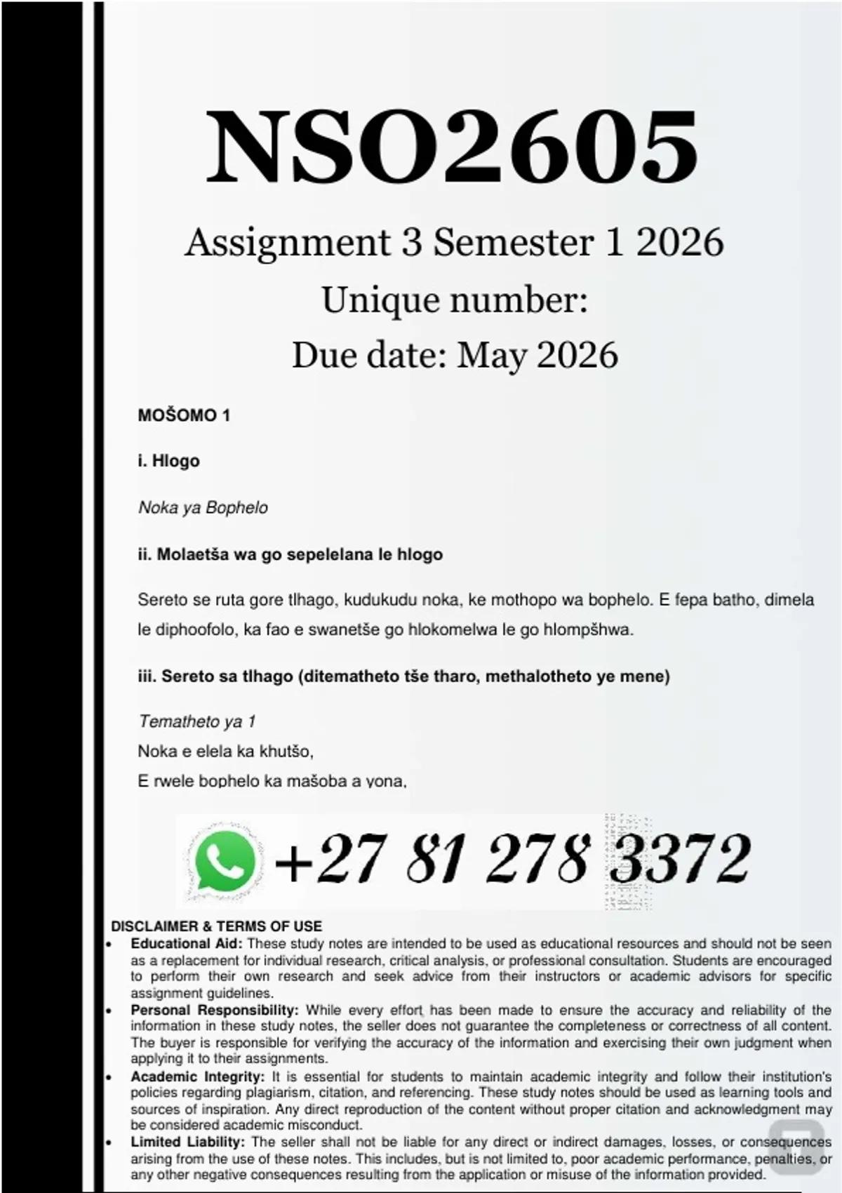 NSO2605 Assignment 3 PORTFOLIO (COMPLETE ANSWERS) Semester 1 2026 - DUE May 2026... Direto le dikoša tša setšo di ka retwa le go opelwa mafelong le mabakeng a go fapana. Ngwala mafelo a mahlano fela. Ngwala magato a mahlano a thulaganyo ya padi o be hlaloše legato le lengwe le le lengwe ka lefoko le tee.Direto tša setšo di arotšwe go ya ka mehuta yeo e fapafapanego. Hlaloša mehuta ye meraro ya direto tša setšo. Hlaloša mehuta ye mebedi ya dikoša tša setšo. Theto ya sebjale/selehono Sebopego le diteng tša theto ya sebjale di hueditšwe ke moya wa theto ya Bodikela. Hlaloša mehuta yeo e latelago ya direto: Thetosello/eletši Thetonyefolo Go na le mehuta yeo e fapanego ya dipadi dingwalong tša Sesotho sa Leboa. Ahlaahla mehuta yeo e latelago ya dipadi. Padi ya botseka Padi ya leago Theto le dikoša tša setšo Direto le dikoša tša setšo di ka retwa le go opelwa mafelong le mabakeng a go fapana. Ngwala mafelo a mahlano fela Theto ya sebjale/selehono Hlaloša mehuta yeo e latelago ya direto: Thetotumišo ya sebjale Lehlologelwa/theto ya leratoTheto le dikoša tša setšo Direto tša tlhago ke direto tšeo di bolelago ka dilo tša tlhago go swana le magadima, dinoka, dimela le mamogašwa. Ngwala sereto se tee sa tlhago. Hlogo Molaetša wa go sepelelana le hlogo Ditematheto tše tharo tša go ba le methalotheto ye mene Dikapolelo le merumokwano Tšhomišo ya polelo ya maleba ya go se be le diphošophošwana le boitlhamelo. O se kopolle sereto sa motho yo mongwe. Lebelela kabo ya meputso go ya ka ruburiki ye: Dintlha Hlogo 1 Molaetša 5 Ditematheto le methalotheto 4 Dikapolelo le merumokwano 4 Tšhomišo ya polelo ya maleba 6 Palomoka 20 Theto ya sebjale goba selehono Thetosello goba eletši e tšweletša maikutlo a go kwa bohloko goba a manyami ka seo se diregilego. Itlhamele thetosello. Mo seretong sa gago go tšwelele dintlha tše di latelago: Hlogo Molaetša wa go sepelelana le hlogo Ditematheto tše tharo tša go ba le methalotheto ye mene Dikapolelo le merumokwano Tšhomišo ya polelo le mantšu a maleba a go se be le diphošophošwana le boitlhamelo. O se kopolle sereto sa motho yo mongwe. Lebelela kabo ya meputso go ya ka ruburiki ye: Dintlha Hlogo 2 Molaetša 3 Ditematheto le methalotheto 5 Dikapolelo le merumokwano 4 Tšhomišo ya polelo le mantšu le boitlhamelo 6 Palomoka 20 Padi Ngwala thulaganyo ya padi yeo o e badilego. Thoma ka go ngwala leina la padi, mongwadi wa yona le mohuta wa padi yeo, gomme o hlaloše padi yeo go ya ka magato a thulaganyo. Kabo ya meputso e tla ba ka tsela ye: Dintlha Leina la padi, mongwadi le mohuta 3 Magato a thulaganyo 15 Tšhomišo ya polelo ya maleba 2 Palomoka 20 Tiragatšo goba terama Terama ya thelebišene e fapana le ya radio ka gore babogedi ba kgona go bona batšeakarolo thelebišeneng. Kgetha terama ya thelebišene goba ya radio yeo o e ratilego le yeo o kilego wa e bogela, gomme o sekaseke babapadi ba yona ka tsela ye: Hlogo goba leina la terama Kahlaahlo ya maina a mahlano a babapadi Tšhomišo ya polelo ya maleba ya go hloka diphošophošwana Kabo ya meputso e tla ba ka tsela ye: Dintlha Hlogo ya terama le mo e tšweletšwago 2 Kahlaahlo ya maina a mahlano a babapadi 10 Tšhomišo ya polelo 8 Palomoka 20 Dingwalo tša sebjalebjale le dipapadi goba dithaloko tša bana Dipapadi tša setšo tša bana di fetišetšwa baneng ba bangwe ka tebelelo ya mahlo. Hlaloša dipapadi tšeo di latelago gomme o fahlele tlhalošo ya gago ka mehlala: Bašemane fela Banenyana fela Ngwala magato a mahlano a thulaganyo ya padi o be hlaloše legato le lengwe le le lengwe ka lefoko le tee. Hlaloša lereo le “ditšhupasefala” Thulaganyo ya terama e tšwelela ka magato a mane. Ngwala le go hlaloša magato a mabedi a mafelelo Dingwalo tša sebjalebjale le dipapadi/dithaloko tša bana Hlaloša dipapadi tša banenyana fela o be o ngwale maina a mane a dipapadi tšeo. Ngwala phapano gare ga dipapadi tša banenyana le tša bašemane o be o ngwale leina le tee la papadi ya banenyana le la papadi ya bašemane Tiragatšo/terama Ahlaahla mehuta yeo e latelago ya diterama: (i) Terama ya phapoši (2) (ii) Terama ya masetlapelo (2) (iii) Terama ya thelebišene (2) (iv) Terama ya sefaleng (2) (v) Terama ya radio Direto tša tlhago ke direto tšeo di bolelago ka dilo tša tlhago go swana le magadima, dinoka, dimela le mamogašwa. Ngwala sereto se tee sa tlhago. Hlogo Molaetša wa go sepelelana le hlogo Ditematheto tše tharo tša go ba le methalotheto ye mene. Dikapolelo le merumokwano Tšhomišo ya polelo ya maleba ya go se be le diphošophošwana le boitlhamelo (o se kopolle sereto sa motho yo mongwe). Lebelela kabo ya meputso go ya ka ruburiki ye Direto le dikoša tša setšo di ka retwa le go opelwa mafelong le mabakeng a go fapana. Ngwala mafelo a mahlano fela. Hlaloša mehuta yeo e latelago ya direto: Thetotumišo ya sebjale Lehlologelwa/theto ya lerato Ditšhupasefala ke mantšu ao a laelago batiragadi ka moo ba swanetšego go dira goba go sepela ka gona mo sethaleng. Magato a mabedi a mafelelo a thulaganyo ya terama ke: Sehloa, e lego karolo yeo mathata a fihlelelago godimo gomme go ba le kgohlano ye kgolo. Kgaogano, e lego karolo ya mafelelo moo mathata a rarolwago gomme tiragatšo e fela. Hlaloša lereo le “ditšhupasefala” Thulaganyo ya terama e tšwelela ka magato a mane. Ngwala le go hlaloša magato a mabedi a mafelelo Hlaloša dipapadi tša banenyana fela o be o ngwale maina a mane a dipapadi tšeo. Direto le dikoša tša setšo di ka retwa le go opelwa mafelong le mabakeng a go fapana. Ngwala mafelo a mahlano fela. Ngwala magato a mahlano a thulaganyo ya padi o be hlaloše legato le lengwe le le lengwe ka lefoko le tee.Direto tša setšo di arotšwe go ya ka mehuta yeo e fapafapanego. Hlaloša mehuta ye meraro ya direto tša setšo. Hlaloša mehuta ye mebedi ya dikoša tša setšo. Theto ya sebjale/selehono Sebopego le diteng tša theto ya sebjale di hueditšwe ke moya wa theto ya Bodikela. Hlaloša mehuta yeo e latelago ya direto: Theto