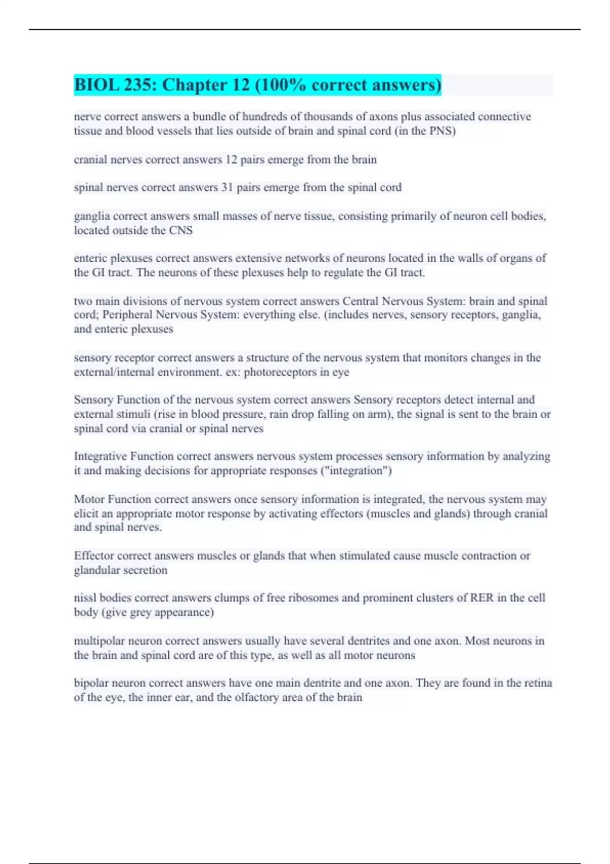 nerve correct answers a bundle of hundreds of thousands of axons plus associated connective tissue and blood vessels that lies outside of brain and spinal cord (in the PNS) cranial nerves correct answers 12 pairs emerge from the brain spinal nerves correct answers 31 pairs emerge from the spinal cord ganglia correct answers small masses of nerve tissue, consisting primarily of neuron cell bodies, located outside the CNS enteric plexuses correct answers extensive networks of neurons located in the walls of organs of the GI tract. The neurons of these plexuses help to regulate the GI tract. two main divisions of nervous system correct answers Central Nervous System: brain and spinal cord; Peripheral Nervous System: everything else. (includes nerves, sensory receptors, ganglia, and enteric plexuses sensory receptor correct answers a structure of the nervous system that monitors changes in the external/internal environment. ex: photoreceptors in eye Sensory Function of the nervous system correct answers Sensory receptors detect internal and external stimuli (rise in blood pressure, rain drop falling on arm), the signal is sent to the brain or spinal cord via cranial or spinal nerves Integrative Function correct answers nervous system processes sensory information by analyzing it and making decisions for appropriate responses ("integration") Motor Function correct answers once sensory information is integrated, the nervous system may elicit an appropriate motor response by activating effectors (muscles and glands) through cranial and spinal nerves. Effector correct answers muscles or glands that when stimulated cause muscle contraction or glandular secretion nissl bodies correct answers clumps of free ribosomes and prominent clusters of RER in the cell body (give grey appearance) multipolar neuron correct answers usually have several dentrites and one axon. Most neurons in the brain and spinal cord are of this type, as well as all motor neurons bipolar neuron correct answers have one main dentrite and one axon. They are found in the retina of the eye, the inner ear, and the olfactory area of the brain
