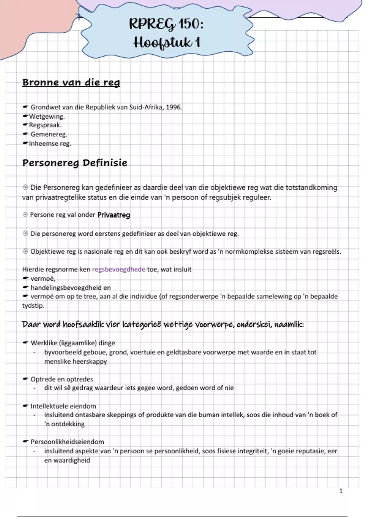 Full summaries of the module Law of Persons for first-year LLB students. The content is summarised out of the Law of Persons by Trynie Boezaart with extra notes. Chapters 1-7 are fully summarised. The summaries are in Afrikaans.