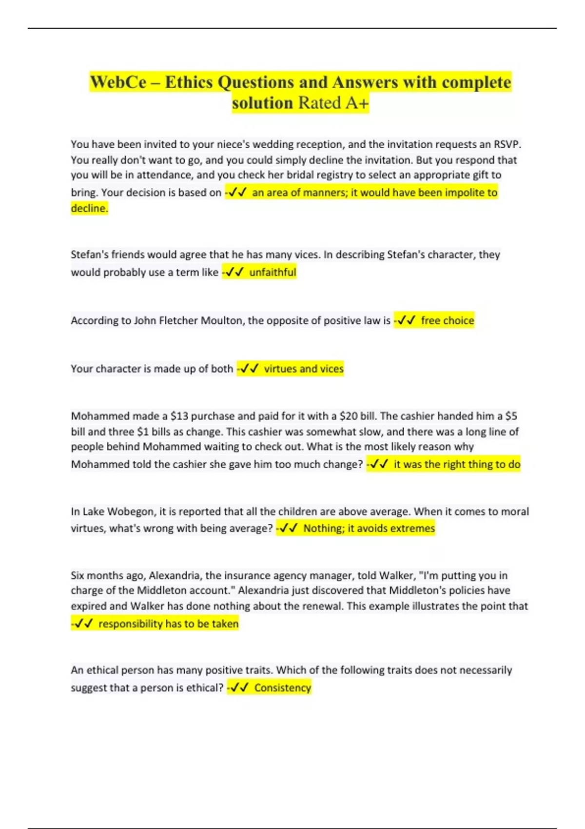 WebCe – Ethics Questions and Answers with complete solution Rated A+