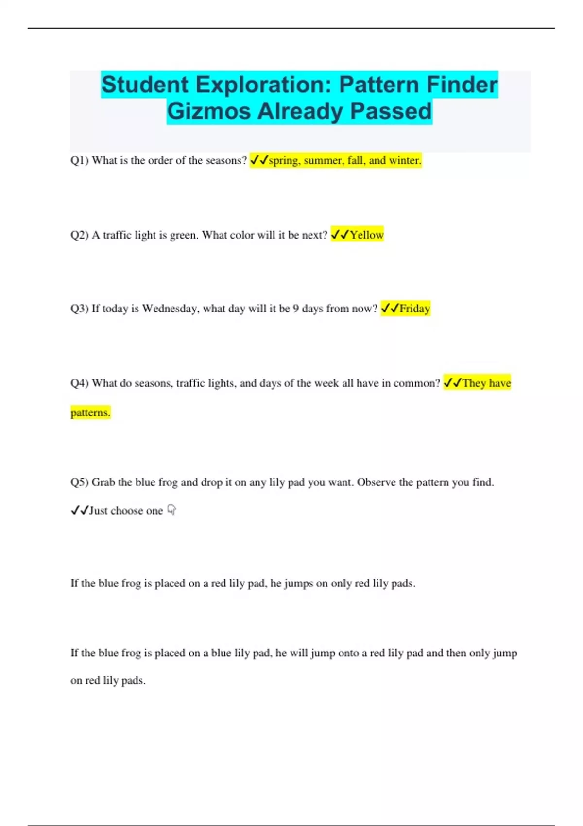 Student Exploration: Pattern Finder Gizmos Already Passed Q1) What is the order of the seasons? spring, summer, fall, and winter. Q2) A traffic light is green. What color will it be next? Yellow Q3) If today is Wednesday, what day will it be 9 days from now? Friday Q4) What do seasons, traffic lights, and days of the week all have in common? They have patterns. Q5) Grab the blue frog and drop it on any lily pad you want. Observe the pattern you find. Just choose one If the blue frog is placed on a red lily pad, he jumps on only red lily pads. If the blue frog is placed on a blue lily pad, he will jump onto a red lily pad and then only jump on red lily pads. If the blue frog is placed on a green lily pad, he will jump onto a red lily pad and then only jump on red lily pads. Q6) Click catch all frogs. Grab the blue frog and put it on a few different pads. Does it follow the same pattern? Yes, the blue frog continues to jump onto a red lily pad and then only jumps on red lily pads. Q7) Predict what color lily pad it will go to if placed on the pad in the top-left corner. Red Q8) You Just ran an experiment to test a pattern. Was your prediction correct? Yes it was. Q9) Put the blue frog on the pad in the top-left corner. What color does it jump to? Only red Q10) Collect Data: Place the brown frog on any blue lily pad. Record the colors it visits in order. R, G, B, R, G, B, R, G, B, R, G, B, R, G, B Q11) Analyze: Put the brown frog on other pads and watch. what pattern does it seem to follow? The same pattern as before. If the brown frog is placed onto a red lily pad, it will go onto a green lily pad, then blue. If placed on a green lily pad, the frog will jump onto a blue lily pad, then red. Q12) What pattern does the pink frog follow? The pink frog's pattern is jumping to the color it was first placed on, if it was first placed to a red lily pad, then it will only land on red lily pads. if placed on a green lily pad, then it will only land on green lily pads. if placed on a blue lily pad, then it will only land on blue lily pads. Q13) Does its pattern depend on where it starts? Explain. No, because its pattern is going to the same colored lily pad. So it doesn't matter where the lily pads are. Q14) Find the pattern: What pattern does the yellow frog follow? g,b,b,r,g,g,b Q15) Extend: Describe the red frog's pattern The red frog has two patterns. One is just jumping from red lily pads to other red lily pads and only red lily pads. While the other pattern is if you place the red frog on a green lily pad, he will jump onto a blue lily pad then onto a green lily pad, and then blue again repeatedly. Q16) How are their patterns similar? The purple and red frogs are similar because if they are placed on red, they will only jump to red lily pads, and if they are placed on a green lily pad, they will jump onto a blue lily pad then back onto a green and back to blue repeatedly. Q17) How are they different? The red frog jumps without pausing. The purple frog has a pause every 2 lily pads it jumps. Q18) Form hypothesis: Put the yellow frog on any pad. Observe it carefully. Try it on other pads. When you think you understand the frog's behavior, write your belief, or hypothesis, below. You only need to choose one If the yellow frog is placed on a red lily pad it will jump onto a blue lily pad, then back to a red and onto another blue and it will do that repeatedly. If the yellow frog is placed on a green lily pad it will jump onto a red lily pad then back to green and then another red repeatedly. If the yellow frog was placed on a blue lily pad it will jump onto a green lily pad then back to blue and back to green repeatedly. Q19) From the blue pad at lower left, the yellow frog will next jump to a __________ pad Green lily pad Q20) From the red pad at lower right, the yellow frog will next jump to a __________ pad Blue lily pad Q21) Test: Run experiments to test your predictions. Were you correct both times? ____________ Yes, I was Q22) Form hypothesis: Now observe the pink frog carefully. What pattern does it repeat? g,r,b,g,r,b,g,r,r,b Q23) Predict: What are the next 10 colors the pink frog will visit if you start it at the bottom left? g,r,b,g,r,b,g,r,r,b Q24) Test: Test your hypothesis. What happened? It went on all the colors I said it would go on. Q25) Challenge: Can you ever absolutely prove that a hypothesis is correct? Explain. No, a hypothesis can be rejected or edited, so it can never be fully correct. Q26) Find a pattern: Place the blue frog on any pad and observe it. What pattern does it follow? I placed the blue frog on the blue lily pad, it proceeded to jump onto 3 more blue lily pads, then onto a green lily pads, then onto two red lily pads, then onto 3 green lily pads, and then the pattern starts all over again. Q27) Analyze: No matter where it starts, what color will it visit least in its first 20 jumps? Why? All the colors. because the pattern is 10 lily pads, 4 blue, 4 green, 2 red. Q28) Observe: Catch the blue frog by dragging it to the bottom of the screen. Observe the red frog. What rules does it appear to follow? It will only go to red and blue lily pads, it will always avoid green lily pads. Q29) What color will it never hit? Red Q30) Explain. The red frog will jump from green to blue lily pads repeatedly. Q31) Starting on green, what color will the red frog spend most of its time on? The red frog will jump from green to blue lily pads, but it will spend most of its time on green lily pads. Q32) Explain. Every time the red frog jumps to a blue lily pad, it immediately jumps back to a green lily pad and stays idle for about 1 second then jumps back to a blue lily pad and once again immediately jumps to green. Q33) Observe: Observe the purple frog. What rules does it appear to follow? Placing the purple frog randomly will give you inconsistent patterns which often result in getting the purple frog to only jump to red lily pads. depending on where you place the purple frog it will