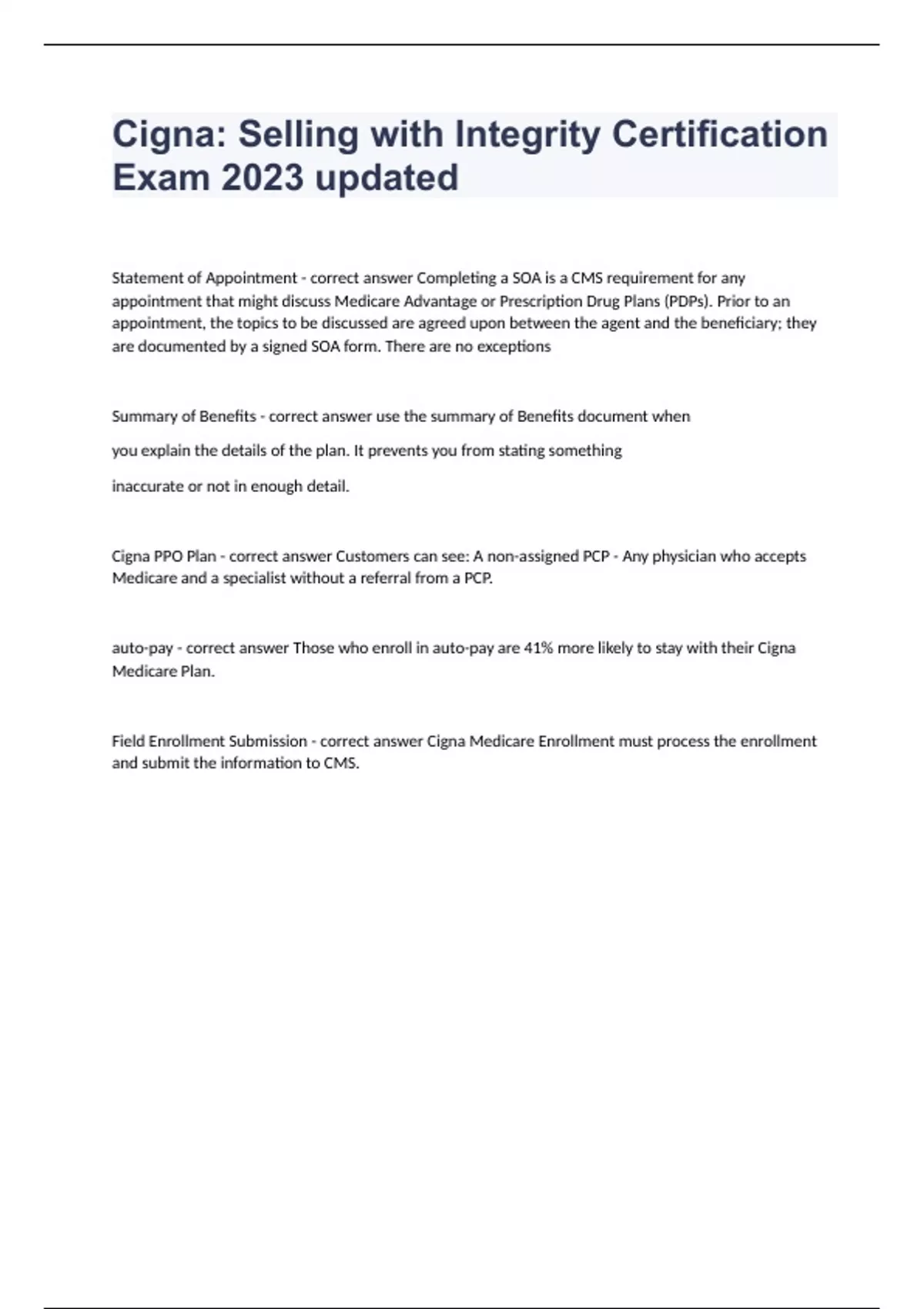 Cigna: Selling with Integrity Certification Exam 2023 updatedStatement of Appointment - correct answer Completing a SOA is a CMS requirement for any appointment that might discuss Medicare Advantage or Prescription Drug Plans (PDPs). Prior to an appointment, the topics to be discussed are agreed upon between the agent and the beneficiary; they are documented by a signed SOA form. There are no exceptions Summary of Benefits - correct answer use the summary of Benefits document when you explain the details of the plan. It prevents you from stating something inaccurate or not in enough detail. Cigna PPO Plan - correct answer Customers can see: A non-assigned PCP - Any physician who accepts Medicare and a specialist without a referral from a PCP. auto-pay - correct answer Those who enroll in auto-pay are 41% more likely to stay with their Cigna Medicare Plan. Field Enrollment Submission - correct answer Cigna Medicare Enrollment must process the enrollment and submit the information to CMS.