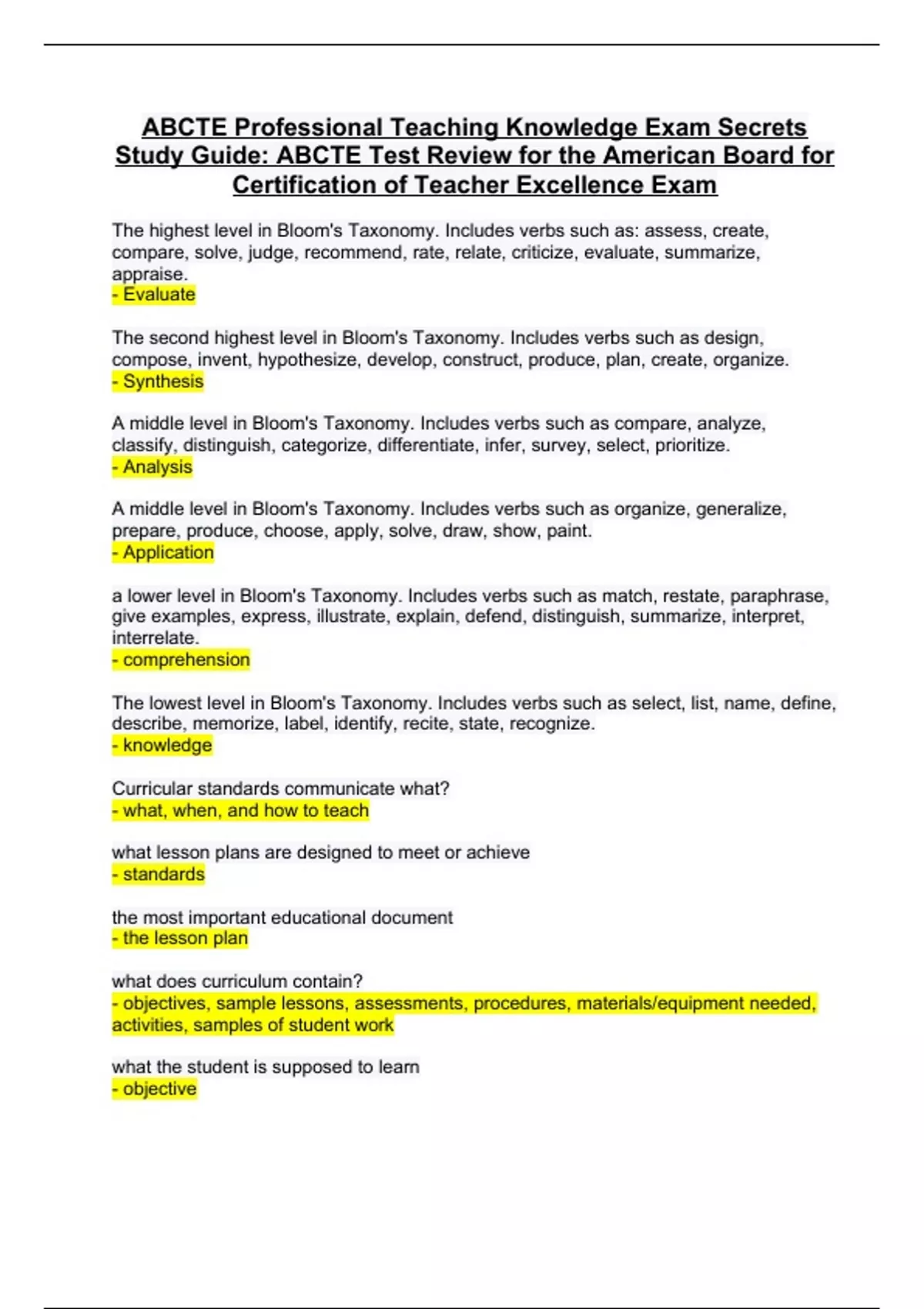 ABCTE Professional Teaching Knowledge Exam Secrets Study Guide: ABCTE Test Review for the American Board for Certification of Teacher Excellence Exam The highest level in Bloom's Taxonomy. Includes verbs such as: assess, create, compare, solve, judge, recommend, rate, relate, criticize, evaluate, summarize, appraise. - Evaluate The second highest level in Bloom's Taxonomy. Includes verbs such as design, compose, invent, hypothesize, develop, construct, produce, plan, create, organize. - Synthesis A middle level in Bloom's Taxonomy. Includes verbs such as compare, analyze, classify, distinguish, categorize, differentiate, infer, survey, select, prioritize. - Analysis A middle level in Bloom's Taxonomy. Includes verbs such as organize, generalize, prepare, produce, choose, apply, solve, draw, show, paint. - Application a lower level in Bloom's Taxonomy. Includes verbs such as match, restate, paraphrase, give examples, express, illustrate, explain, defend, distinguish, summarize, interpret, interrelate. - comprehension The lowest level in Bloom's Taxonomy. Includes verbs such as select, list, name, define, describe, memorize, label, identify, recite, state, recognize. - knowledge Curricular standards communicate what? - what, when, and how to teach what lesson plans are designed to meet or achieve - standards the most important educational document - the lesson plan what does curriculum contain? - objectives, sample lessons, assessments, procedures, materials/equipment needed, activities, samples of student work what the student is supposed to learn - objective methods of determining effectiveness of the lessons - assessments What was the purpose of No Child Left Behind and the Every Student Succeeds Act? - to create a standardized curriculum for each subject area what is curriculum? - what the students are supposed to learn as a result of a specific educational sequence of events anchor papers - the reference for all other work; what is expected by students Who can help translate curriculum? - administrators and content specialists order the steps of instruction: re-design, teach, repeat, review, give assessment, write assessment, identify time limit of unit, evaluate instruction, review for assessment - 1. identify time limit of unit 2. write assessment 3. teach 4. review for assessment 5. give assessment 6. evaluate instruction 7. re-design 8. repeat Objectives should be specific enough that they can be used as ____________ questions. - Exam Lesson Objectives: what the students will ___________________ by the end of the lesson. - accomplish Agenda Items: what the class will ___________ to meet the lesson objectives. - do Pacing of material is dependant upon 3 things - 1. nature of students 2. nature of material 3. goals of the teacher periodic measuring devices that indicate student growth and also verify successful lessons - assessments should you schedule assessments based on the calendar date or the progress of the class? - based on progress of the class Who do you need to know before you begin planning lessons? - your students who can help you get to know your students? - prior teachers, counselors, administrators, other colleagues How much repetition is enough? - as much as possible until mastery is acheived What should inform your instruction? - assessments Name three important things to consider when choosing a seating arrangement. - 1. visibility of students 2. movement by the teacher 3. space for isolation 4. students should always be in front of the teacher 5. utilize a second teacher's desk in the room 6. considers the distance between students what is fostered when students are seated close together or in groups? - interaction between students when should you prepare class rules and their consequences? - BEFORE school begins Name some ways to create a positive learning environment. - 1. greet students at the door 2. display examples of student work 3. make the classroom feel open, welcoming, and caring Definition= The learning and practice of teaching - Pedagogy Lessons are intended for the _________________ of the audience, not for the ____________________ of the teacher. - benefit convenience What are the steps of the Learning Cycle based on Piaget's learning theory? - 1. exploration 2. concept introduction 3. concept application In Piaget's learning cycle, exploration is what? - the beginning of instruction addresses the concrete level of thinking- lower order thinking skills teacher's job is to replace misconceptions with correct knowledge When beginning a lesson, you should provide... - a context for the material In Piaget's learning cycle, concept introduction is... - the teaching stage the guided discovery stage- students are constructing meaning based on the teacher's lessons In Piaget's learning cycle, concept application is... - where students apply what they have learned to new situations students formulate a new idea or understanding should lead directly into the exploration stage of the next curricular concept what are some ways to identify what the students already know? - 1. offer a pre-test on the material 2. group discussion 3. student interviews 4. classroom participation how can you provide context for learning new concepts? - create "bridges" between the old and the new what are some ways to stimulate active learning? - 1. minimize unnecessary info or distractions 2. utilize sufficient relevant examples 3. organize curriculum around a central theme or idea 4. require review, memorization, repetition, and mnemonic devices 5. provide study and memory aides prior to the lesson warm-up, lecture, demonstrations, gallery walk, using graphic organizers, and questioning are all teaching strategies to use with what types of groups? - whole/large groups what is a "bell ringer"? - daily work that is completed by the students as soon as they enter the room allows the teacher time to complete clerical tasks this is the most common and efficient whole group teaching str