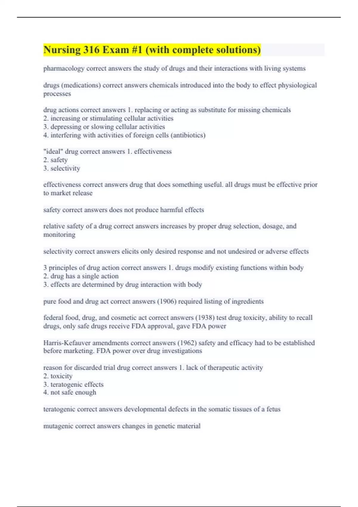 pharmacology correct answers the study of drugs and their interactions with living systems drugs (medications) correct answers chemicals introduced into the body to effect physiological processes drug actions correct answers 1. replacing or acting as substitute for missing chemicals 2. increasing or stimulating cellular activities 3. depressing or slowing cellular activities 4. interfering with activities of foreign cells (antibiotics) "ideal" drug correct answers 1. effectiveness 2. safety 3. selectivity effectiveness correct answers drug that does something useful. all drugs must be effective prior to market release safety correct answers does not produce harmful effects relative safety of a drug correct answers increases by proper drug selection, dosage, and monitoring selectivity correct answers elicits only desired response and not undesired or adverse effects 3 principles of drug action correct answers 1. drugs modify existing functions within body 2. drug has a single action 3. effects are determined by drug interaction with body pure food and drug act correct answers (1906) required listing of ingredients federal food, drug, and cosmetic act correct answers (1938) test drug toxicity, ability to recall drugs, only safe drugs receive FDA approval, gave FDA power Harris-Kefauver amendments correct answers (1962) safety and efficacy had to be established before marketing. FDA power over drug investigations reason for discarded trial drug correct answers 1. lack of therapeutic activity 2. toxicity 3. teratogenic effects 4. not safe enough teratogenic correct answers developmental defects in the somatic tissues of a fetus mutagenic correct answers changes in genetic material