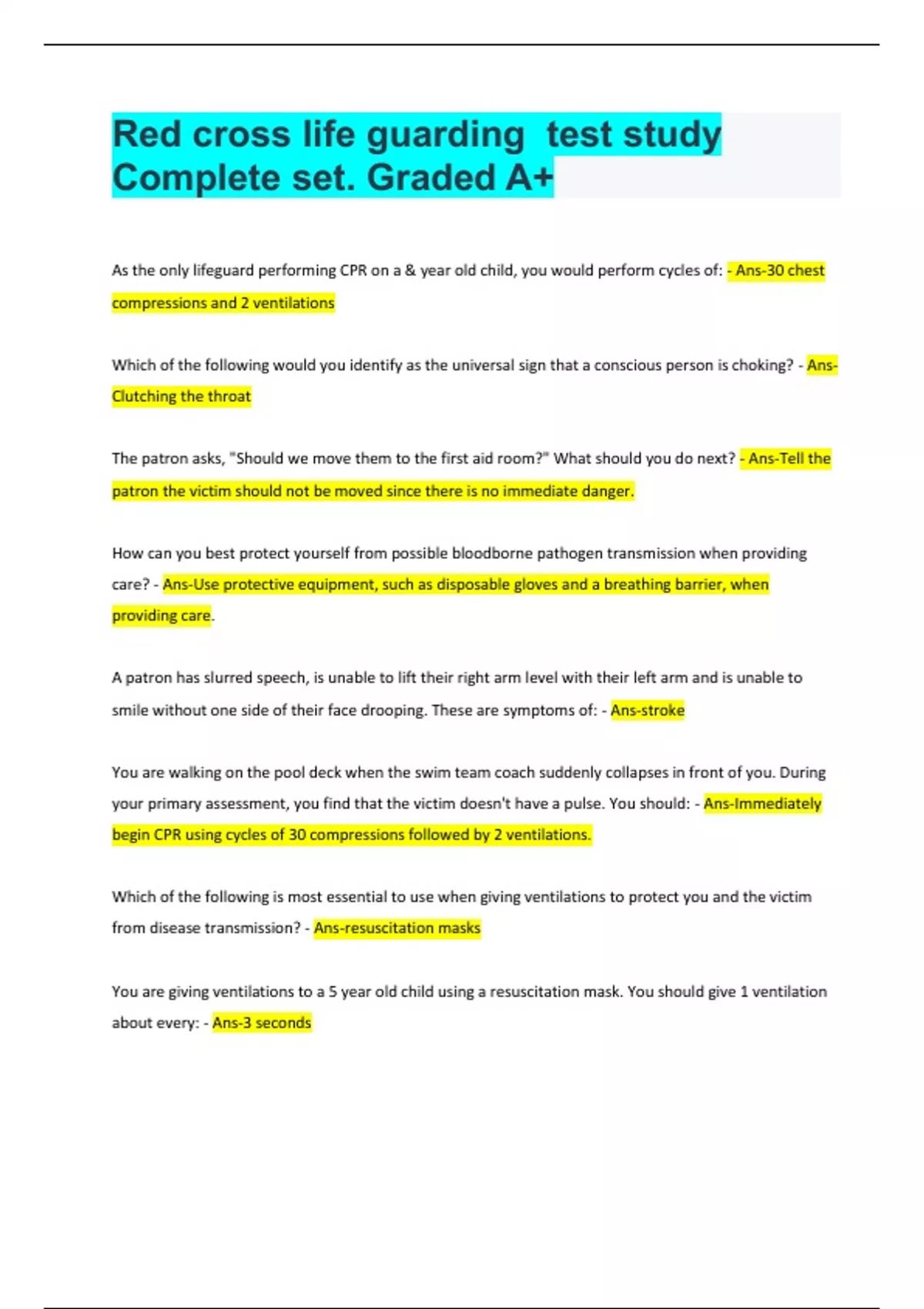 Red cross life guarding test study Complete set. Graded A+ Document Content and Description Below As the only lifeguard performing CPR on a & year old child, you would perform cycles of: - Ans-30 chest compressions and 2 ventilations Which of the following would you identify as the universal si gn that a conscious person is choking? - Ans-Clutching the throat The patron asks, "Should we move them to the first aid room?" What should you do next? - Ans-Tell the patron the victim should not be moved since there is no immediate danger. How can you best protect yourself from possible bloodborne pathogen transmission when providing care? - Ans-Use protective equipment, such as disposable gloves and a breathing barrier, when providing care. A patron has slurred speech, is unable to lift their right arm level with their left arm and is unable to smile without one side of their face drooping. These are symptoms of: - Ans-stroke You are walking on the pool deck when the swim team coach suddenly collapses in front of you. During your primary assessment, you find that the victim doesn't have a pulse. You should: - Ans-Immediately begin CPR using cycles of 30 compressions followed by 2 ventilations. Which of the following is most essential to use when giving ventilations to protect you and the victim from disease transmission? - Ans-resuscitation masks You are giving ventilations to a 5 year old child using a resuscitation mask. You should give 1 ventilation about every: - Ans-3 seconds You are providing care to an adult who is unresponsive and not breathing as a result of a drowning. You give your first ventilation before performing CPR and notice that the chest doesn't rise. Which of the following should you do next? - Ans-Re-tilt the victim's head and then attempt another ventilation. A patron seems to be having a diabetic emergency. You should: - Ans-Give them a glucose tablets. While preparing to use an AED on a victim, you notice a medication patch on the victim's chest. Which action is appropriate? - Ans-Removing the patch with a gloved hand. What statement about BVMs is most accurate? - Ans-Ventilations are more effective when 2 rescuers operate the BVM. you complete a primary assessment and find that the victim has a pulse but is not breathing. Which of the following should you do next? - Ans-give ventilations at a rate of 1 about every 5-6 seconds You and another lifeguard are preparing for CPR on an adult who collapsed in the locker room. You determine that there is no breathing or pulse and state, "Victim has no pulse. Begin CPR." Which of the following should the other lifeguard do next? - Ans-begin chest compressions A patron has cut their leg on the edge of the bleachers and is bleeding heavily. You think the patron is in shock because they: - Ans-become reckless and irritable A person has been injured and is responsive. You obtain consent to check the victim for life threatening conditions. What life-threatening conditions would require you to immediately summon EMS personnel? - Ans-persistent chest pain You determine that a victim is unresponsive but breathing. While waiting with the victim for EMS personnel, you would position the victim: - Ans-in a recovery position An AED indicates that "no shock is advised". What is most appropriate to do next ? - Ans-perform CPR for about 2 minutes. Show Less Last updated: 6 months ago