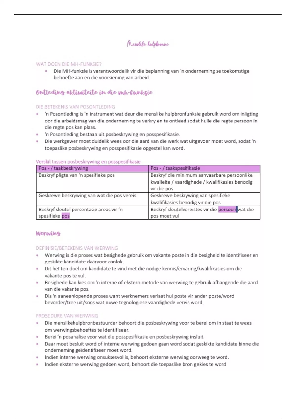 Beskryf pligte van ‘n spesifieke pos Beskryf die minimum aanvaarbare persoonlike