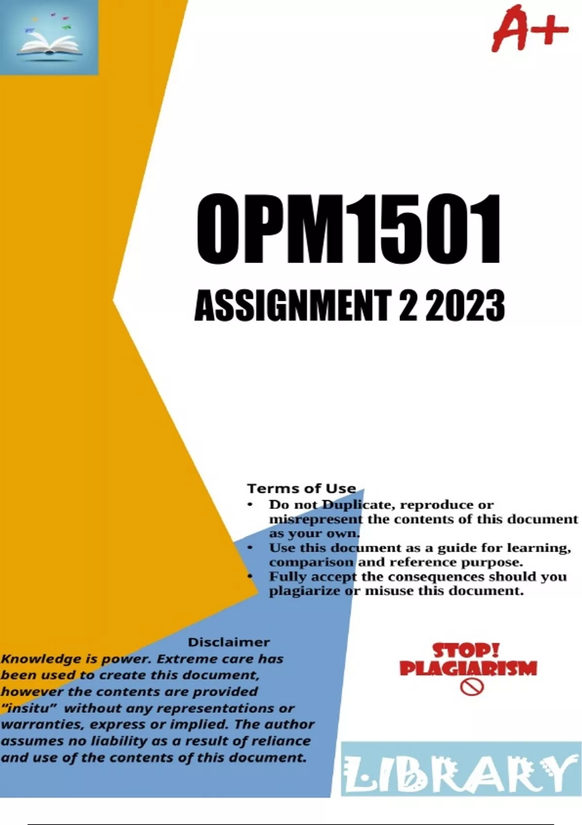 OPM1501 Assignment 2 2024 (Unique Number: 839194) – DUE 21 June 2024 ;100 % TRUSTED workings, explanations and solutions. For assistance call or W.h.a.t.s.a.p.p us on ...(.+.2.5.4.7.7.9.5.4.0.1.3.2)........... 1. In OPM1501, we advocate for the need for mathematics teachers to shift from traditional teaching approaches and embrace an approach that promotes learner engagement and meaning making. 1.1. Use your own words to explain what the above statement means for you. (5) 1.2. Give THREE reasons why there should be a shift in the thinking about mathematics teaching. (3) 1.3. Comment on the following statement: ‘it is easier for a mathematics teacher to teach through rote learning’. (2) 1.4. Write a 1000-word essay in which you critically demonstrate your understanding of the above statement with a lens on the teaching and learning of measurement in any grade in the Intermediate Phase. You should include examples, either from your learning experience at school, general reading, your understanding of the curriculum or observation as a learner to illustrate the points that you make. Please use rubric 1 provided at the end of this Tutorial Letter, to guide the structuring of your essay. It is important that you use this rubric to do self-evaluation before you submit to ensure that you have completed all the required elements for the essay adequately. (30) [40] 2. Describe what is meant by compensation to add or subtract. (4) 2.1. Provide TWO examples for compensation to add and demonstrate how you would teach the method to your Grade 4 learners . (8) 2.2. Provide TWO examples for compensation to subtract and demonstrate how you would teach the method to your Grade 4 learners. (8) 3. Illustrate the following numbers using base 10 blocks: (a) 845 (2) (b) 976 (2) (c) 2051 (2) (d) 2376 (2) (e) 101 (2) ASSESSMENT 02 UNIQUE NUMBER –839194 Closing date: Friday, 21 June 2024, 11:00 PM OPM1501/102/0/2024 4. Test the following numbers for divisibility by 5, 6 and 11(Do not divide or factorise). a) (3) b) (3) 5. To this end, Van de Walle et al (2016) see a lesson as consisting of three main parts: before, during and after. For each of the following statements, state the part of the lesson they represent: a) Provide hints and suggestions when the group is searching for a place to begin or when they stumble. (2) b) Time for the class to share ideas. (2) c) Give learners space to explain their solutions and processes. (2) 6. When you set tasks for your learners, you could tell them: “Use the ideas you own to solve this problem”. 7. Use Dienes blocks to illustrate the following operations: a) 34 + 47 (2) b) 296 + 205 (2) c) 64 – 27 (2) d) 516 – 209 (2) 8. Use the place value chat to represent the following numbers: a) 4875 (2) b) 39870 (2) c) 27 (2) 9. Compare the following fractions 35 and 37 by using the area model. Make accurate drawings.