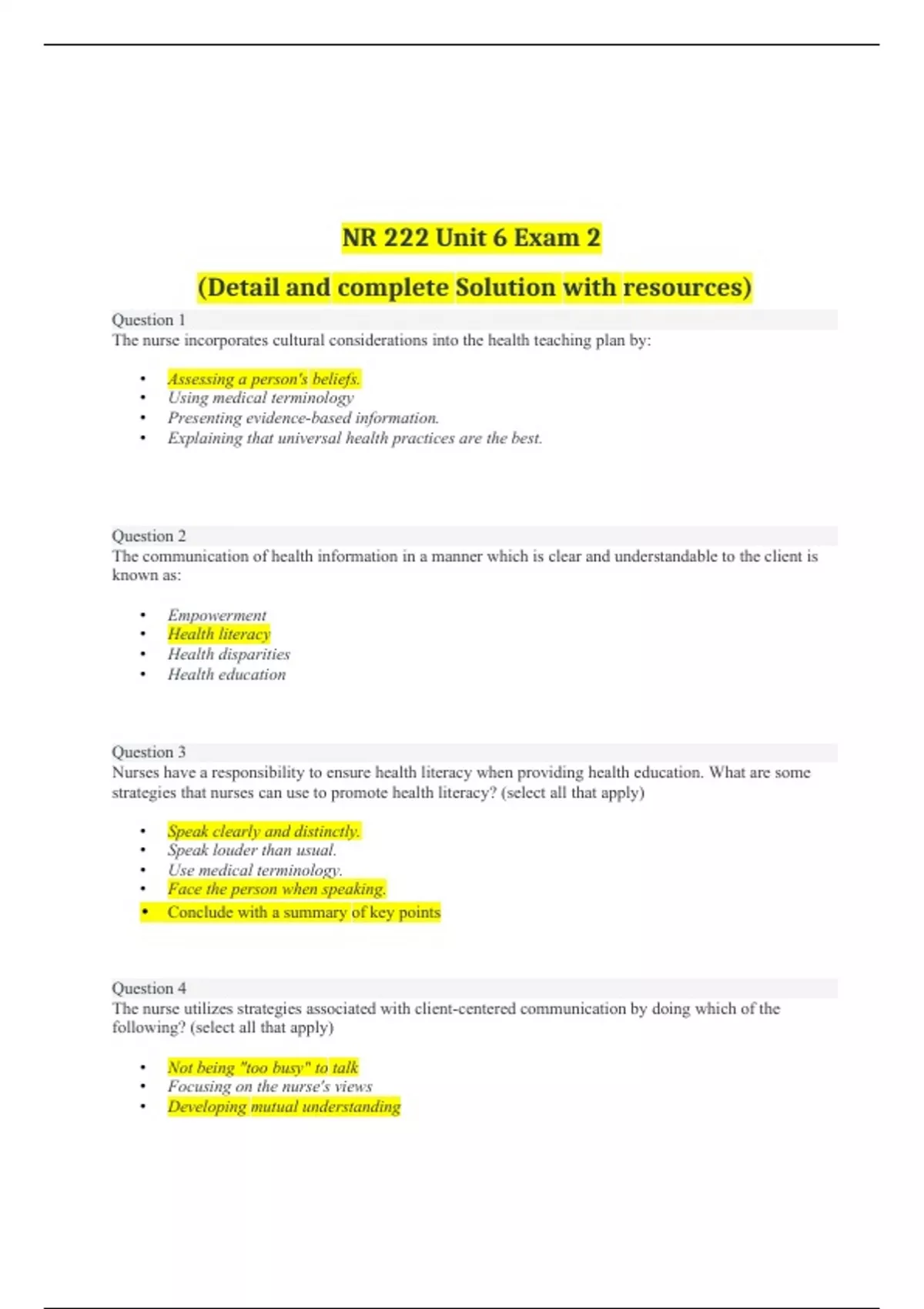 NR 222 Unit 6 Exam 2 Questions with 100% Correct Answers The nurse incorporates cultural considerations into the health teaching plan by: • Assessing a person's beliefs. • Using medical terminology • Presenting evidence-based information. • Explaining that universal health practices are the best. The communication of health information in a manner which is clear and understandable to the client is known as: • Empowerment • Health literacy • Health disparities • Health education Nurses have a responsibility to ensure health literacy when providing health education. What are some strategies that nurses can use to promote health literacy? (select all that apply) • Speak clearly and distinctly. • Speak louder than usual. • Use medical terminology. • Face the person when speaking. • Conclude with a summary of key points