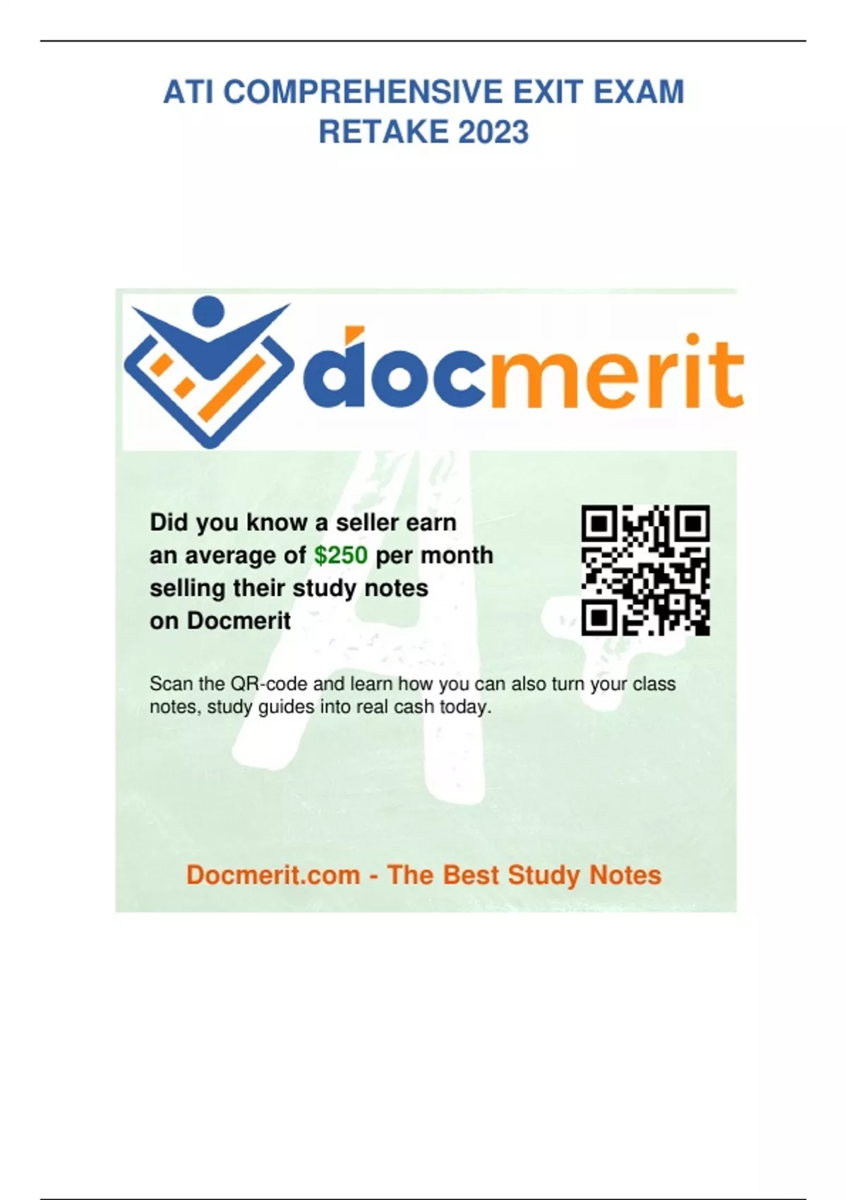 ATI COMPREHENSIVE EXIT EXAM RETAKE 2023 Did you know a seller earn an average of $250 per month selling their study notes on Docmerit Scan the QR-code and learn how you can also turn your class notes, study guides into real cash today.