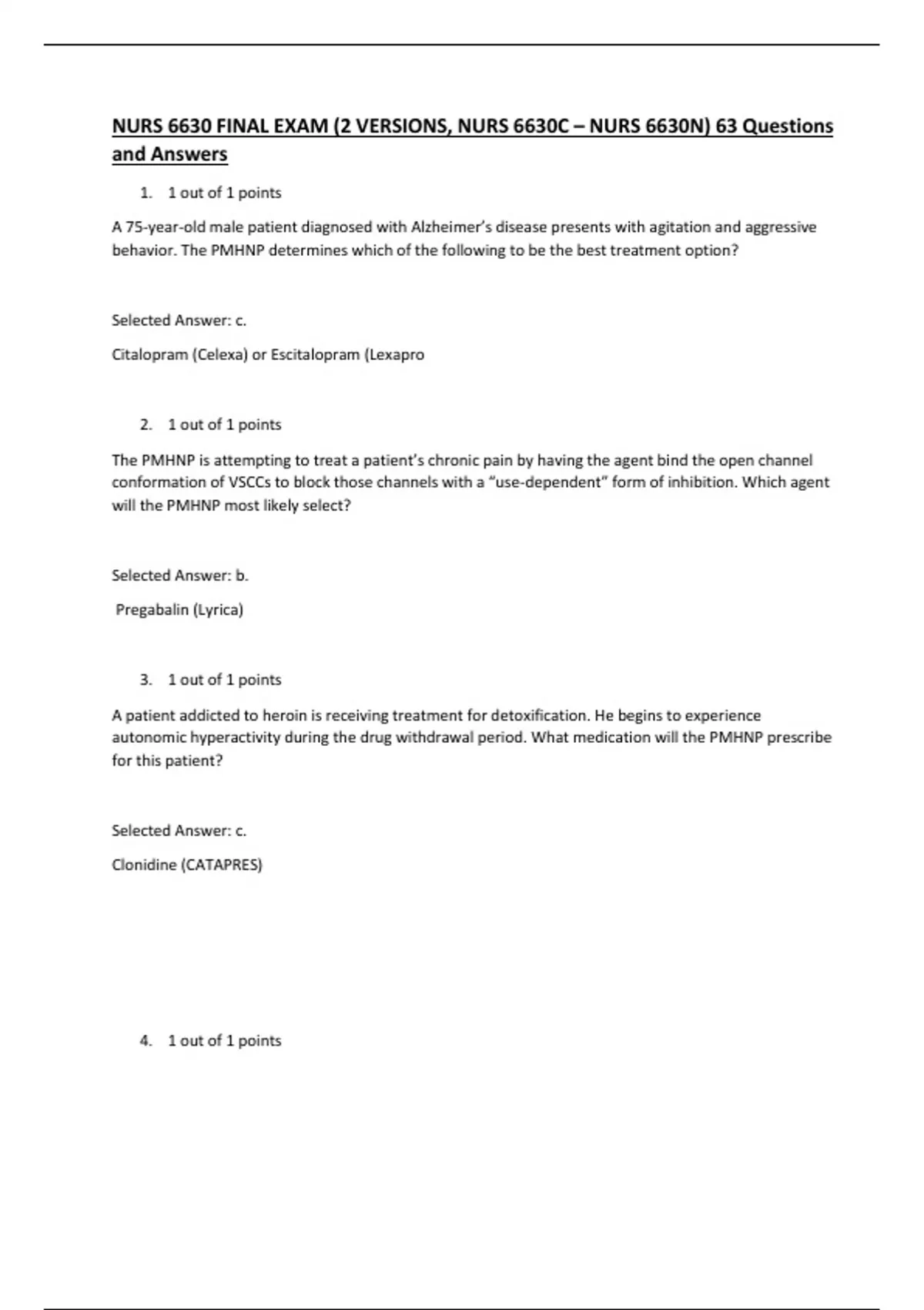 NURS 6630 FINAL EXAM (2 VERSIONS, NURS 6630C – NURS 6630N) 63 Questions and Answers.1. 1 out of 1 points A 75-year-old male patient diagnosed with Alzheimer’s disease presents with agitation and aggressive behavior. The PMHNP determines which of the following to be the best treatment option? Selected Answer: c. Citalopram (Celexa) or Escitalopram (Lexapro 2. 1 out of 1 points The PMHNP is attempting to treat a patient’s chronic pain by having the agent bind the open channel conformation of VSCCs to block those channels with a “use-dependent” form of inhibition. Which agent will the PMHNP most likely select? Selected Answer: b. Pregabalin (Lyrica) 3. 1 out of 1 points A patient addicted to heroin is receiving treatment for detoxification. He begins to experience autonomic hyperactivity during the drug withdrawal period. What medication will the PMHNP prescribe for this patient? Selected Answer: c. Clonidine (CATAPRES)
