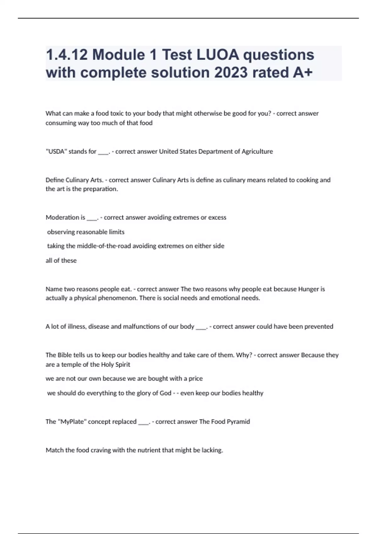 1.4.12 Module 1 Test LUOA questions with complete solution 2023 rated A+What can make a food toxic to your body that might otherwise be good for you? - correct answer consuming way too much of that food "USDA" stands for ___. - correct answer United States Department of Agriculture Define Culinary Arts. - correct answer Culinary Arts is define as culinary means related to cooking and the art is the preparation. Moderation is ___. - correct answer avoiding extremes or excess observing reasonable limits taking the middle-of-the-road avoiding extremes on either side all of these Name two reasons people eat. - correct answer The two reasons why people eat because Hunger is actually a physical phenomenon. There is social needs and emotional needs. A lot of illness, disease and malfunctions of our body ___. - correct answer could have been prevented The Bible tells us to keep our bodies healthy and take care of them. Why? - correct answer Because they are a temple of the Holy Spirit we are not our own because we are bought with a price we should do everything to the glory of God - - even keep our bodies healthy The "MyPlate" concept replaced ___. - correct answer The Food Pyramid Match the food craving with the nutrient that might be lacking.