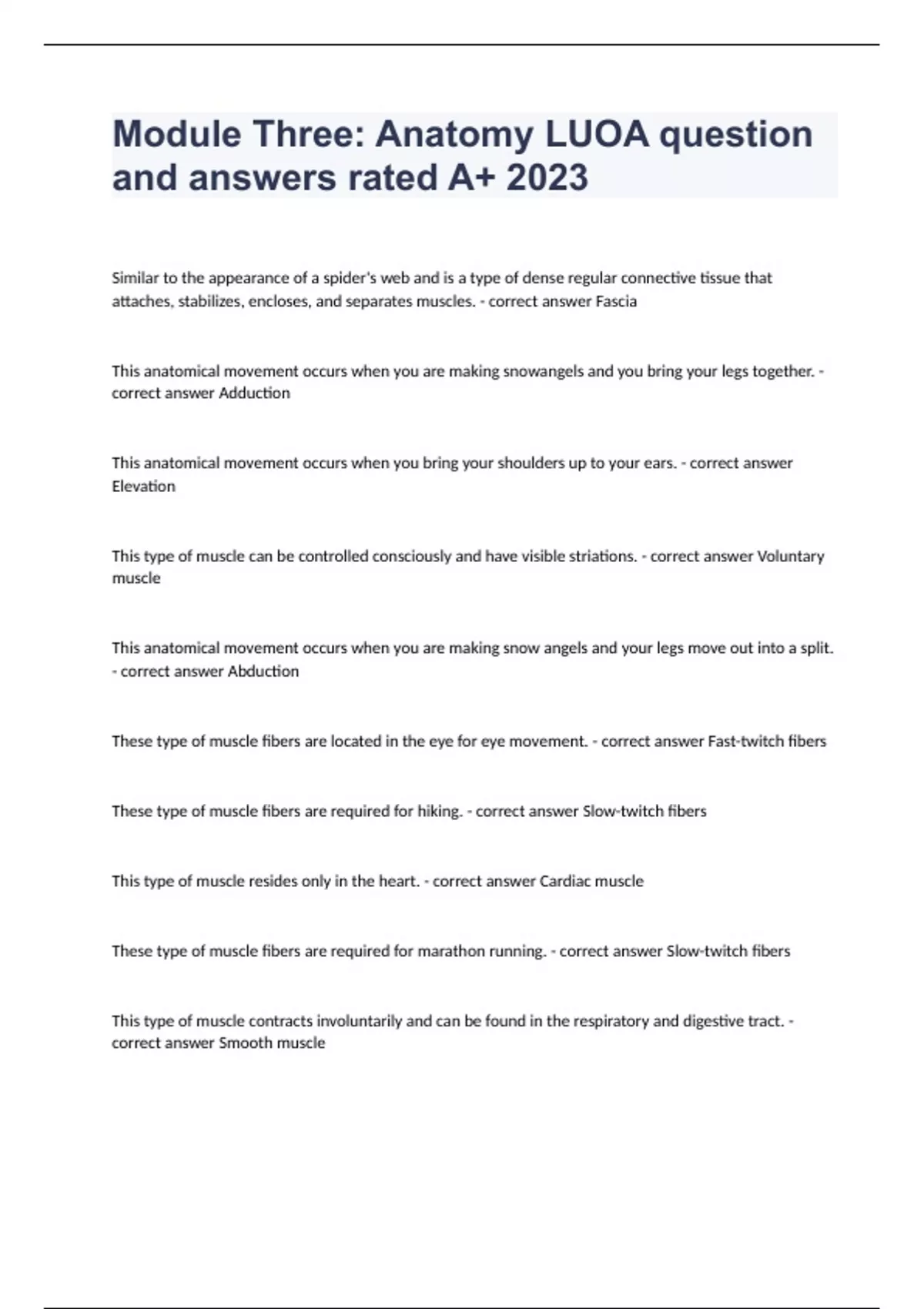 Module Three: Anatomy LUOA question and answers rated A+ 2023Similar to the appearance of a spider's web and is a type of dense regular connective tissue that attaches, stabilizes, encloses, and separates muscles. - correct answer Fascia This anatomical movement occurs when you are making snowangels and you bring your legs together. - correct answer Adduction This anatomical movement occurs when you bring your shoulders up to your ears. - correct answer Elevation This type of muscle can be controlled consciously and have visible striations. - correct answer Voluntary muscle This anatomical movement occurs when you are making snow angels and your legs move out into a split. - correct answer Abduction These type of muscle fibers are located in the eye for eye movement. - correct answer Fast-twitch fibers These type of muscle fibers are required for hiking. - correct answer Slow-twitch fibers This type of muscle resides only in the heart. - correct answer Cardiac muscle These type of muscle fibers are required for marathon running. - correct answer Slow-twitch fibers This type of muscle contracts involuntarily and can be found in the respiratory and digestive tract. - correct answer Smooth muscle This type of muscle is able to contract voluntarily, usually attaches to the skeleton, and assists in