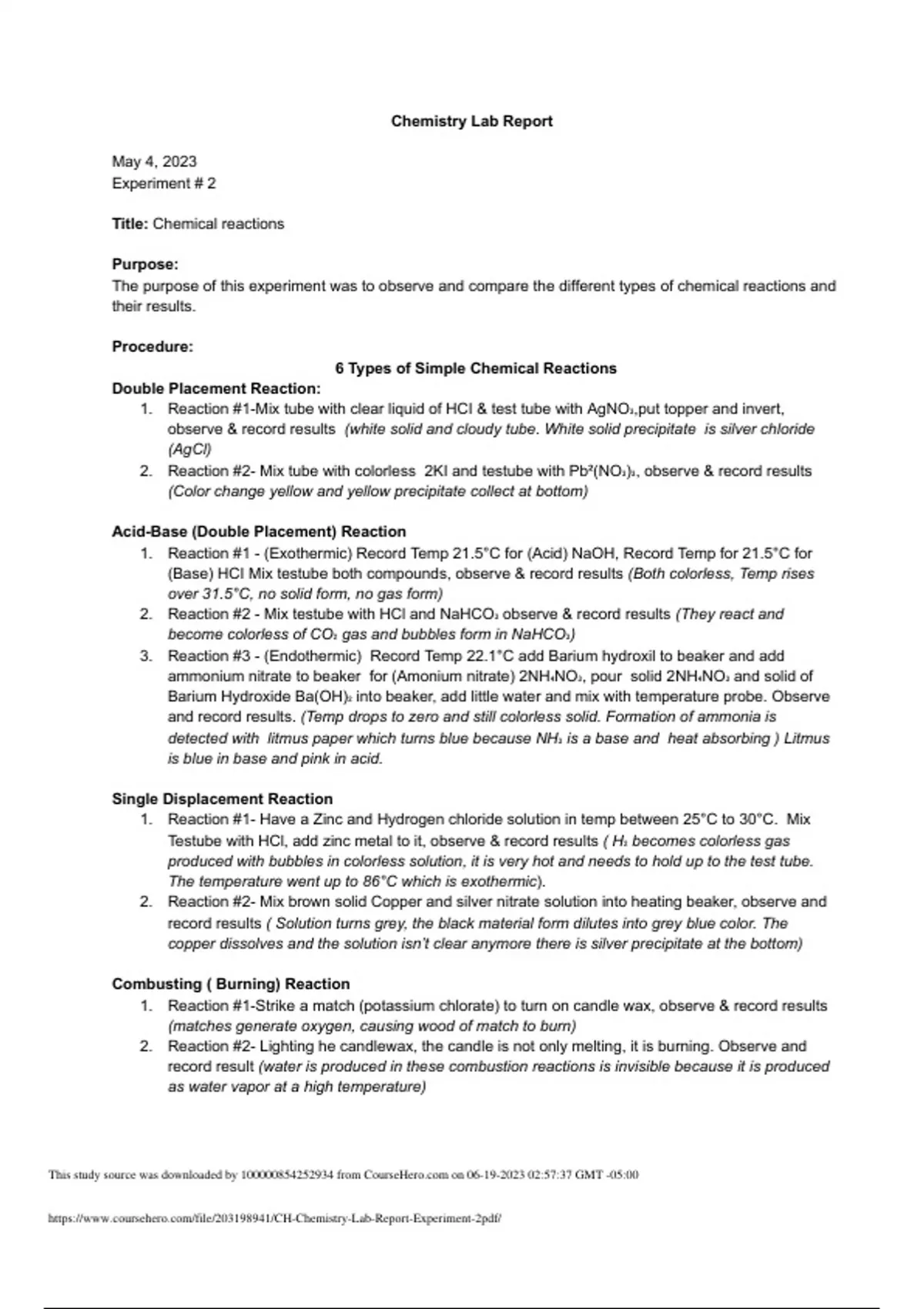 CHEM 103 lab Report Experiment (Portage learning)2023